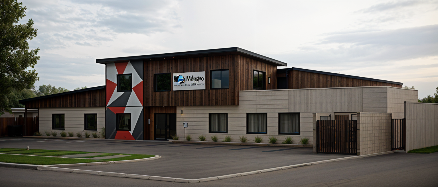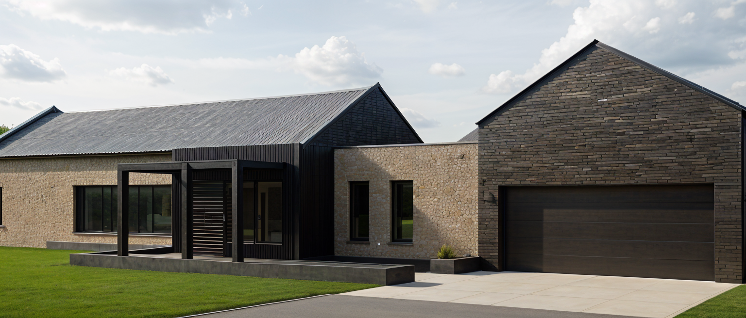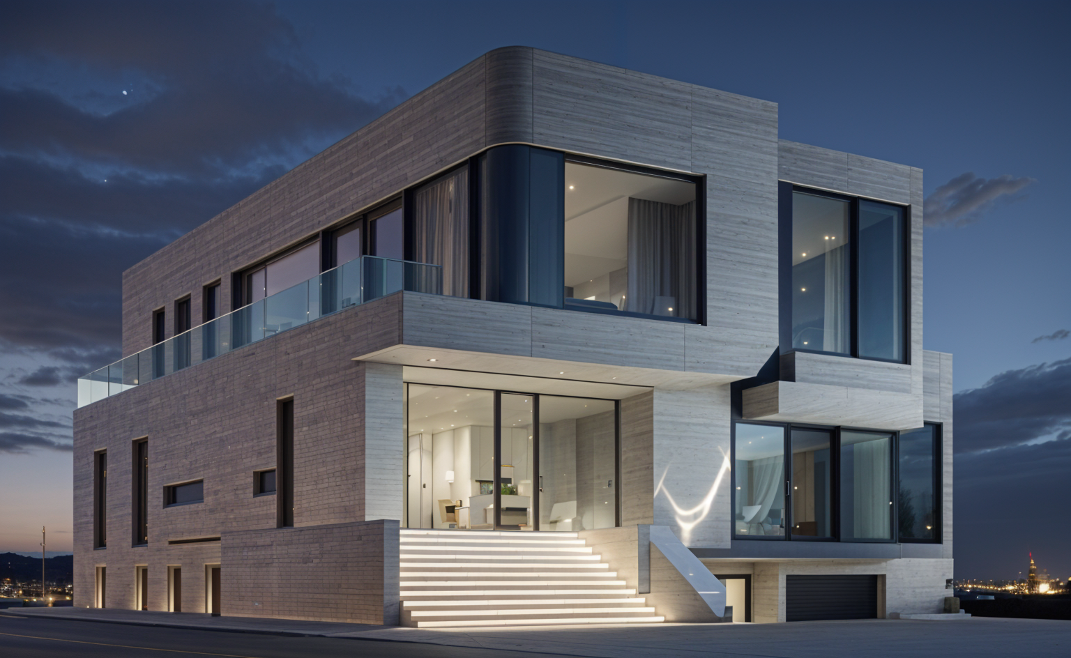 modernist exterior shot terracotta brown horizontal cladding paint color for walls is yellow beige lighted wall lamp wood pvc ceiling architecture