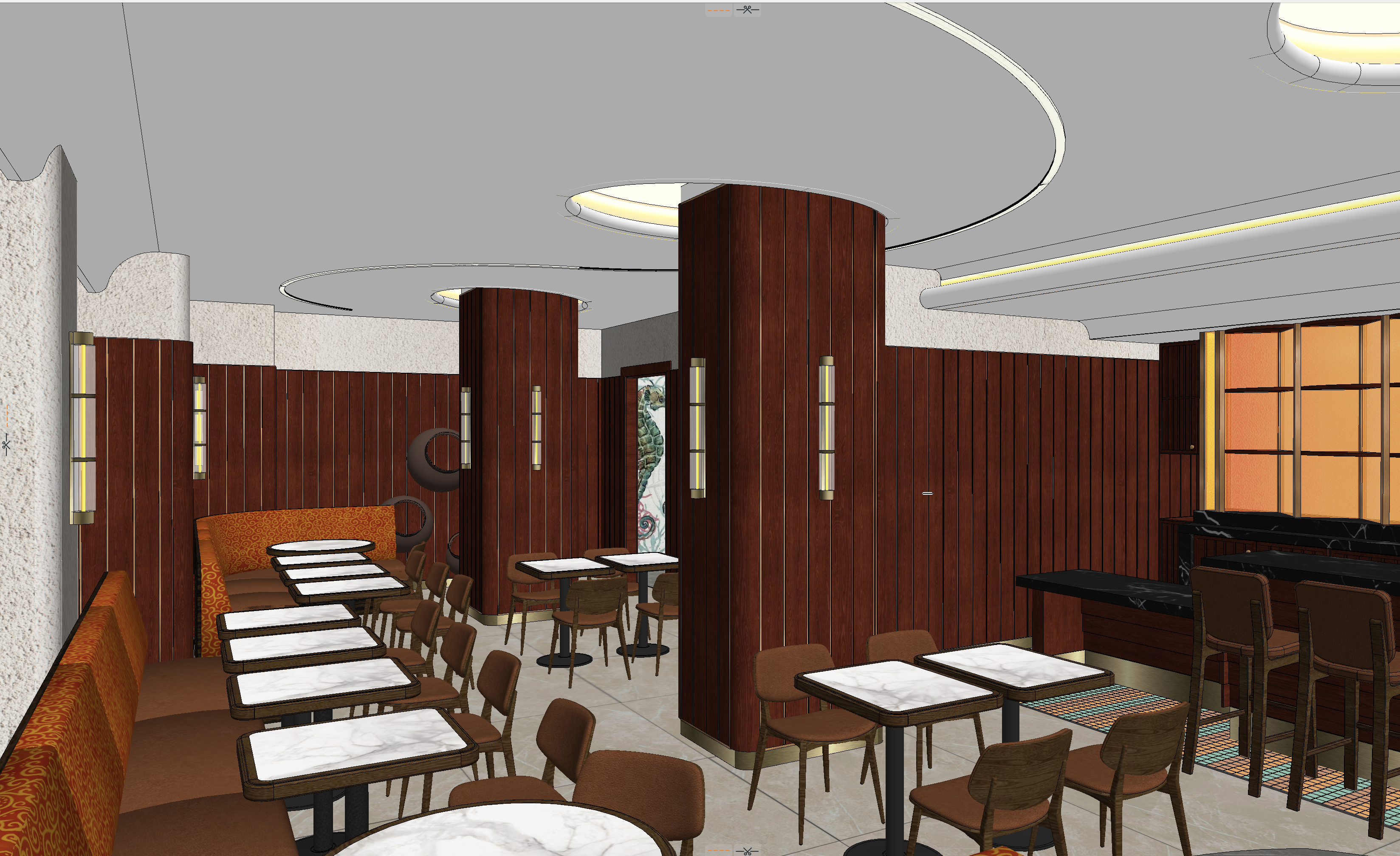 transform the provided restaurant interior image into a high end photorealistic catalog style render with natural daylight illumination while keeping everything exactly the same maintain identical proportions furniture placement ceiling forms bar configuration materials colors textures chairs tables wall panels flooring and spatial arrangement do not modify any geometry layout objects patterns or composition only enhance realism with soft natural daylight balanced exposure subtle ambient shadows clear material definition wood grain depth marble reflections fabric texture and crisp photographic clarity final result should look like a luxury restaurant brochure image unchanged except for improved realism and daylight rendering quality