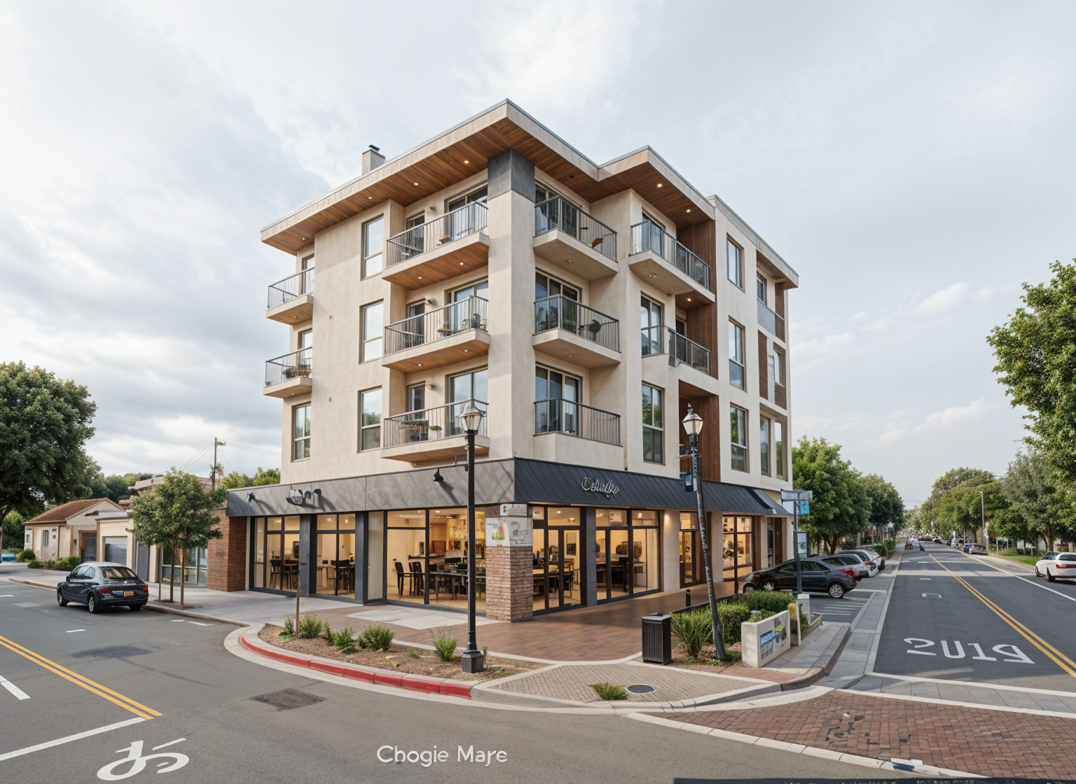 remove these two trees and add a 4 story building with a stone and plaster tuscan design with retail stores at the ground level and apartments on the top floors