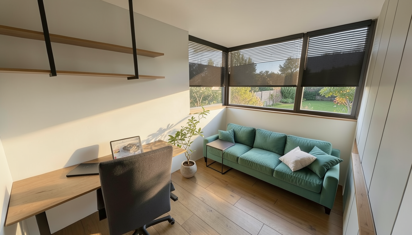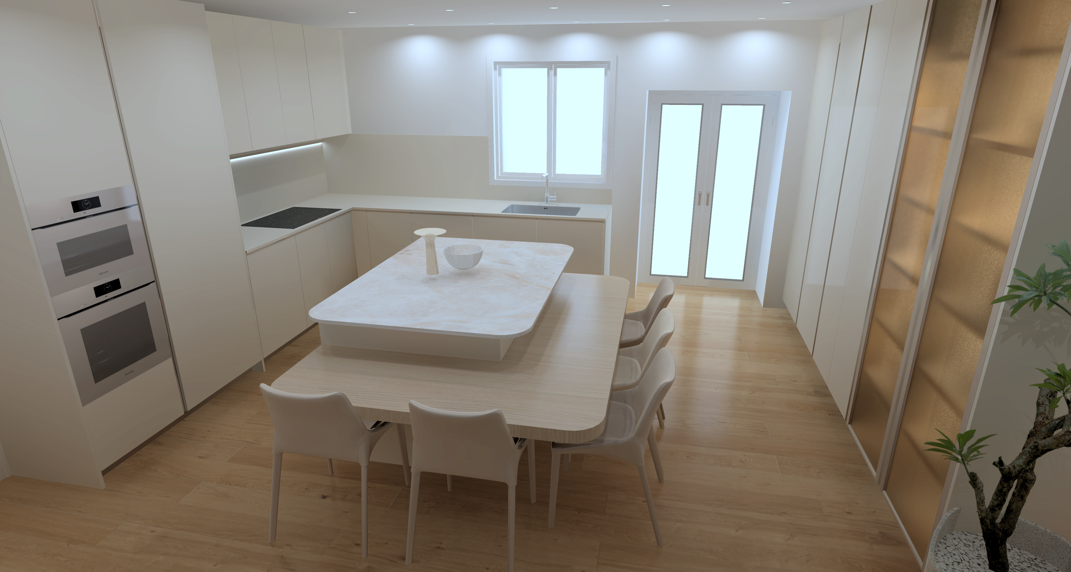 act as an award winning architectural photographer and senior cgi to photo compositing artist specialized in transforming sketchup style interior renders into indistinguishable high end photoreal architectural photographs your task is to convert the provided image into a fully photorealistic interior photograph while strictly preserving the original architecture layout and composition 1 absolute preservation rules non negotiable preserve exactly architecture dimensions proportions and layout camera position focal length feel perspective and framing horizon line vertical alignment and composition balance do not move resize add or remove any elements modify furniture placement cabinetry openings or fixtures alter spatial relationships or staging maintain a perfectly consistent architectural perspective no warping no reinterpretation 2 camera photographic realism simulate a full frame professional architectural camera setup maintain natural lens behavior minimal distortion clean verticals and controlled perspective add subtle photographic qualities fine natural grain realistic depth and micro contrast avoid hdr look over sharpening artificial clarity 3 materials surface realism high priority replace all materials with ultra realistic 4k 8k pbr textures including accurate albedo roughness gloss normal maps micro displacement where needed precise material definitions floor natural wood parquet flooring matte finish not glossy cabinetry furniture beige melamine finish soft matte to satin reflectance slight tonal variation and realistic edge detailing countertop plan de travail same beige melamine finish as cabinetry continuous homogeneous appearance realistic soft reflections non plastic non glossy dense tactile premium look glass doors fluted ribbed strong bronze tinted color blured glass with light behind cant see into it very blured just the light and shadows of objects subtle vertical striation physically accurate light diffusion and reflections slight opacity with realistic depth all surfaces must include micro scratches slight smudges edge wear imperfect reflectivity realistic seams and joints 4 vegetation natural elements replace all plants with botanically accurate ultra detailed foliage include variation in leaf size orientation and density natural branching randomness subsurface scattering light passing through leaves avoid decorative or artificial cgi plant appearance 5 lighting global illumination use natural daylight only consistent with openings ensure physically accurate sun direction soft realistic shadows with penumbra global illumination and bounced light subtle ambient occlusion maintain balanced interior exterior exposure no blown highlights or artificial brightness 6 atmosphere color grading apply true to life photographic grading neutral whites accurate beige and wood tones controlled contrast and dynamic range add subtle atmospheric depth realistic air perspective 7 final realism target the final image must be indistinguishable from a real architectural photograph suitable for publication in a premium design magazine 8 negative constraints strict no cgi look no plastic or fake materials no exaggerated reflections no artificial glow or bloom no layout or design changes no added or removed objects no stylization or artistic reinterpretation