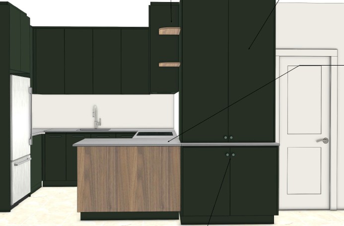 put some stools at the island bench and have some cooking at the cooktop add 2 pendants above the island make cabinetry polytec oasis smooth colour and remove 1 bar stool in front of cabinet remove black arrow line make the cabinetry a deeper borttle green