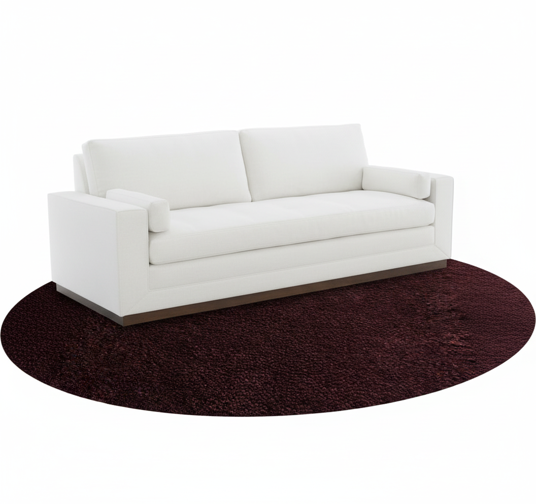 change white couch fabric to the color and texture or reference picture add and oval rug underneath couch in the darker reference picture color and texture slide rug further back under couch