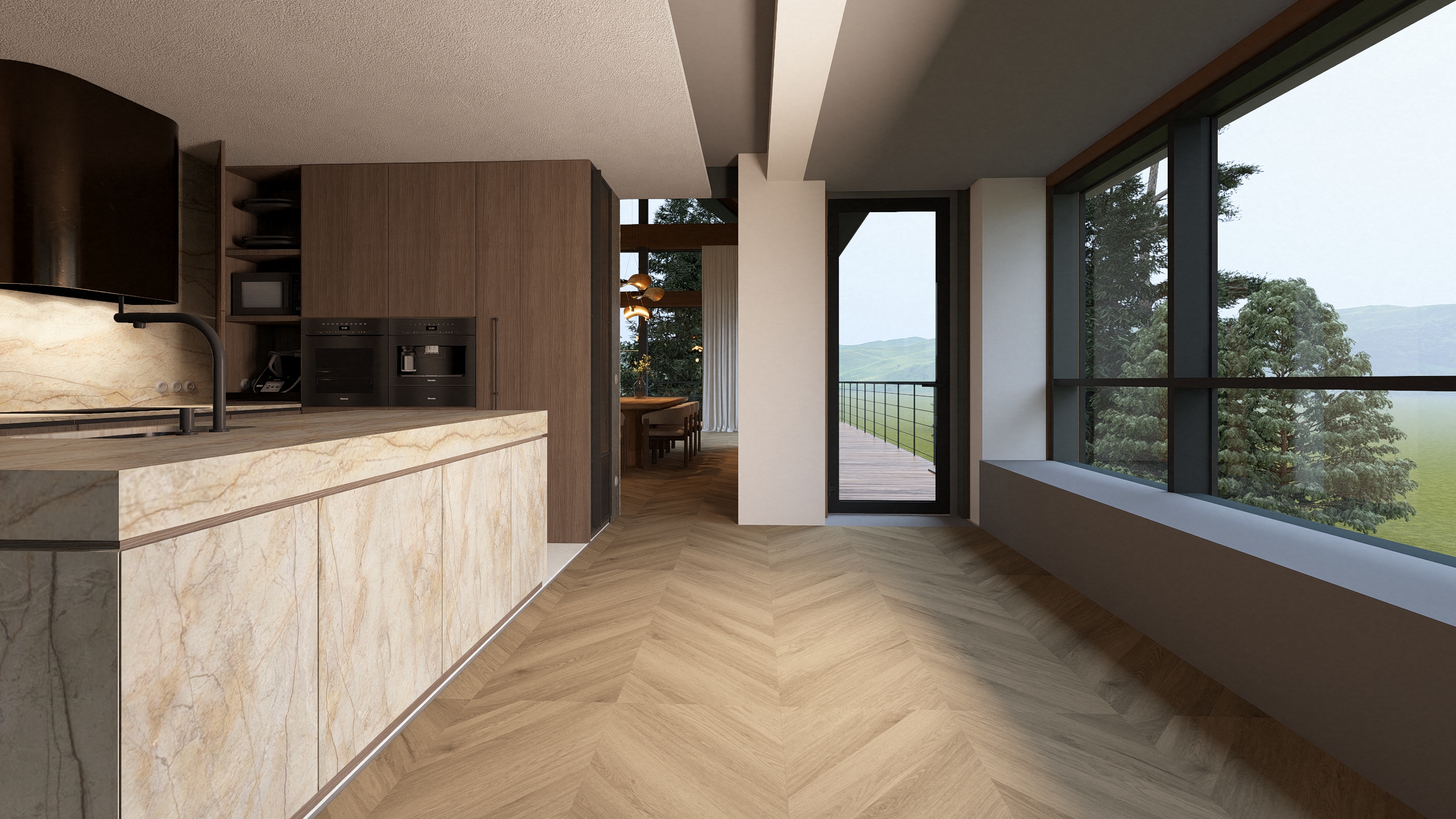 one the right next to the windo ad a wooden table some chairs and sitting on the window sill with pillows replace beige stone with grey matte marble add track led lighting on the ceiling replace white ceiling with wooden planks add some kitchen apliances on the countertop