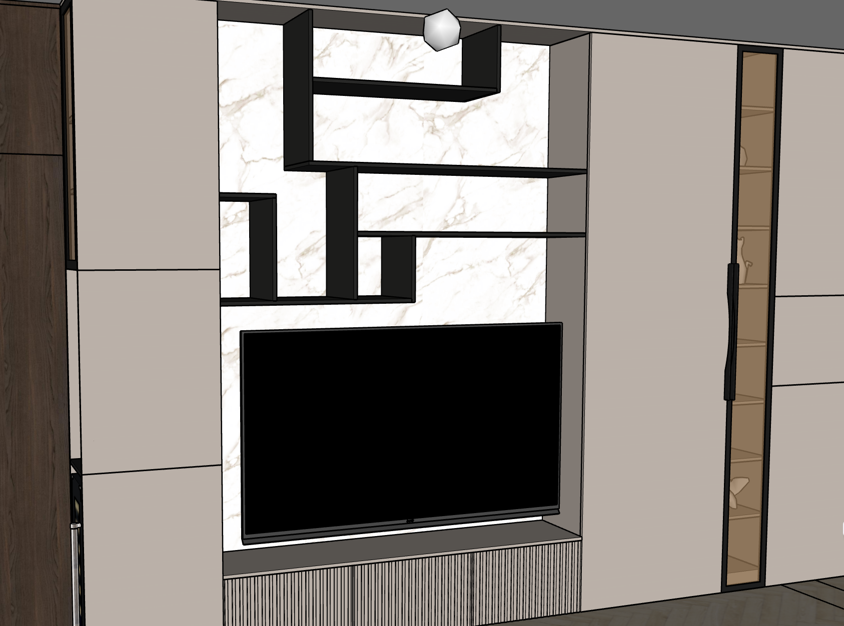 keep all colors as in pisture tv on wall element under tv has gates with stakes and shelfs above the tv are black