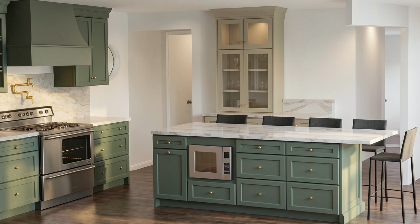keep the lay out the same change the small top beige cabinets in the back top towards the ceiling not glass and keep the bottom long cabinets glass