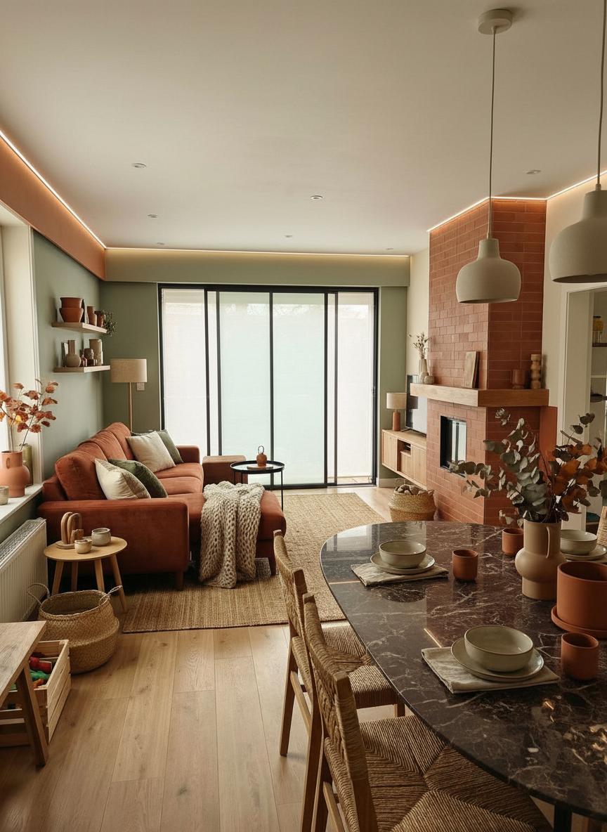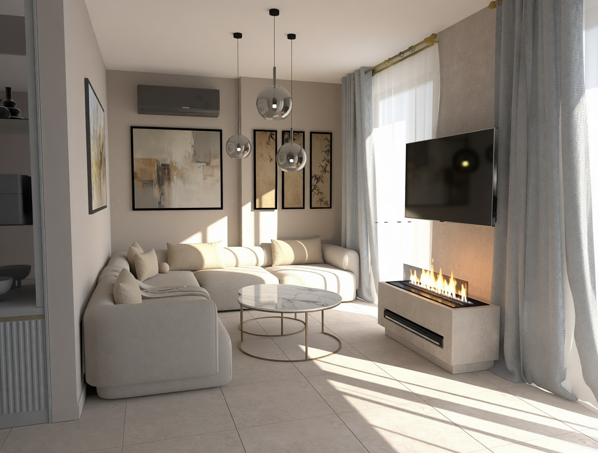 render this image as photo realisitic do not add anything to the room do not put anything in the cabinets the floors and countertops should be matte the range hood cabinet handles and faucet should have a rich brushed brass finish the upper cabinet doors left and right of the range hood should have black steel frames