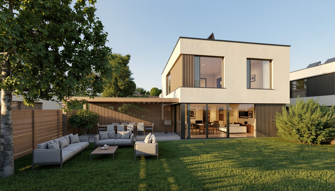 a manicured lawn layered flower beds low maintenance shrubs native plants stone pathway leading to the entrance