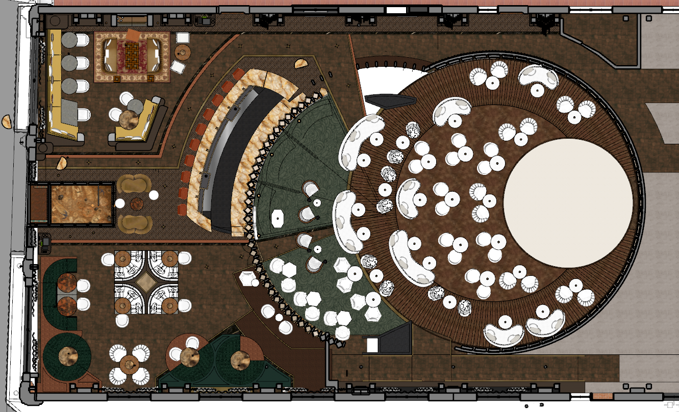 create a luxurious restaurant interior with an elegant and contemporary design featuring a rich brown wood floor with circular patterns the seating area includes plush white chairs and sofas arranged in a sophisticated and orderly layout the bar section is adorned with a sleek black countertop highlighted with warm golden accents surround the dining tables with deep green circular carpets adding a touch of nature and coziness incorporate subdued ambient lighting to create a warm and inviting atmosphere highlight architectural details in dark wood complementing the overall aesthetic keep the color palette earthy and harmonious using soft whites deep greens rich browns and subtle gold touches to evoke warmth and sophistication
