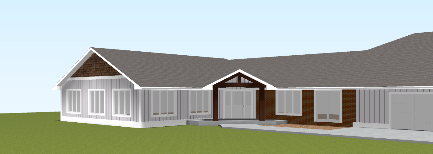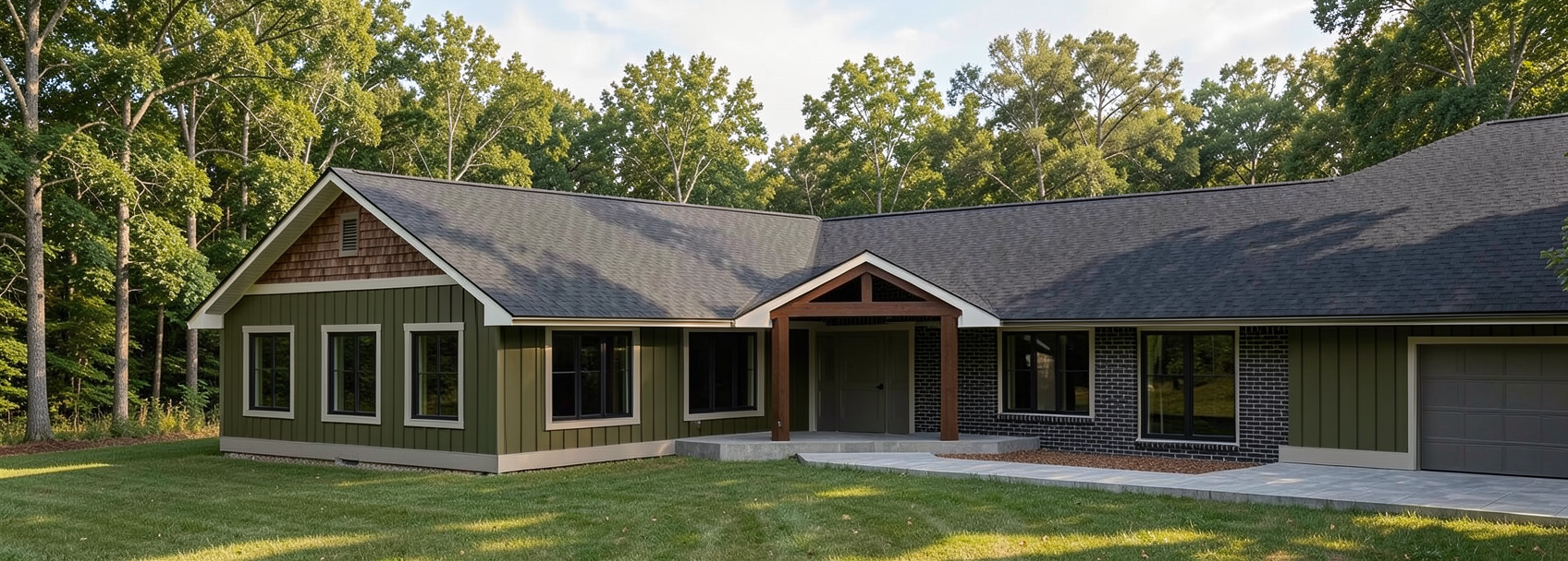 dark olive green siding black windows bronze trim bronze fascia bronze soffit black shingles black brick brown shakes in gable add trees in backdrop