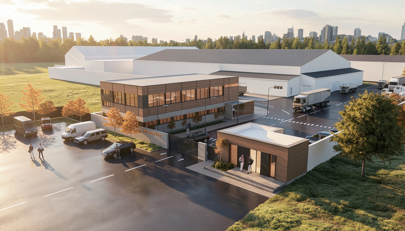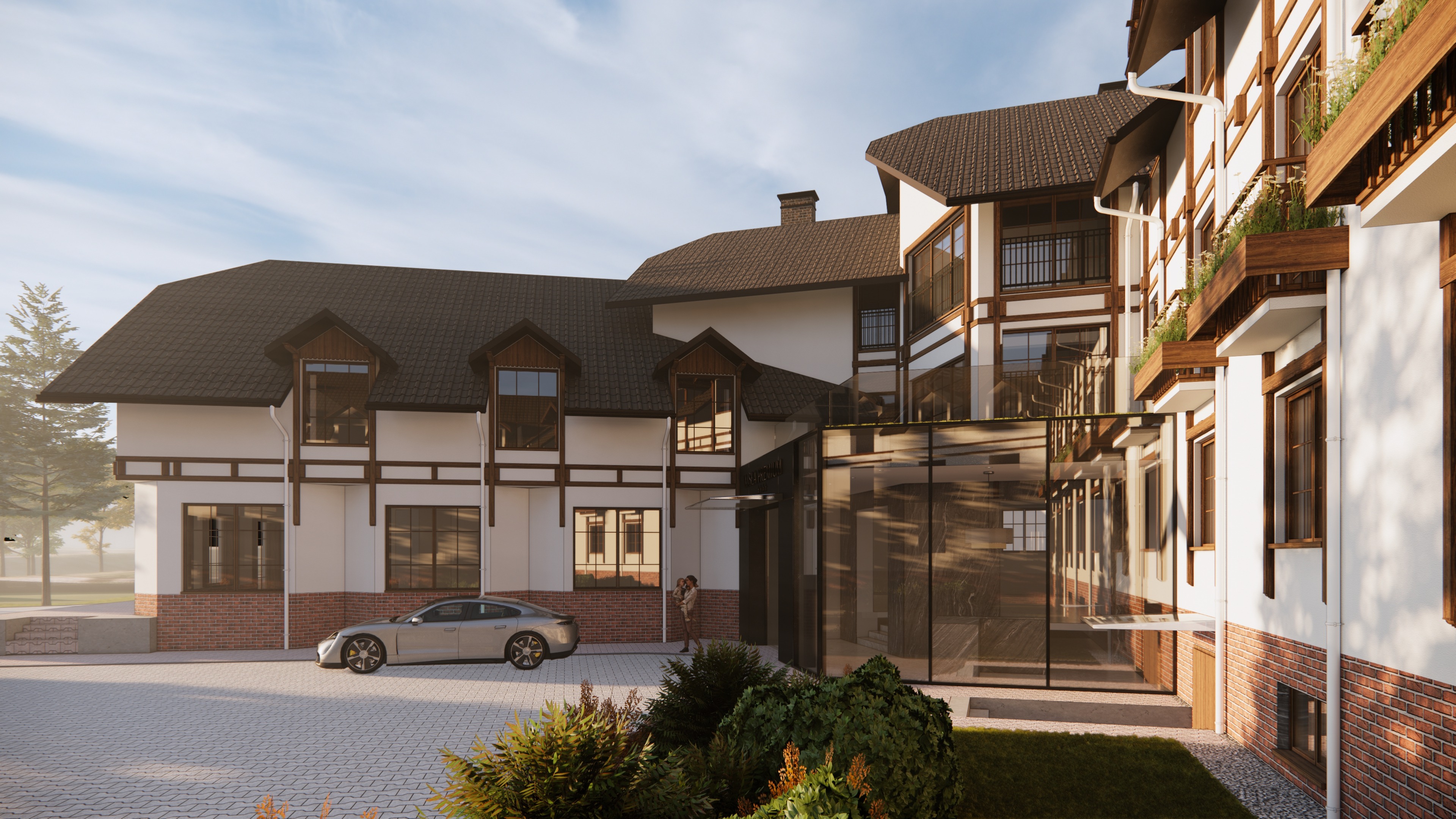 exterior shot transform this non realistic visualization into a highly photorealistic render while keeping the exact architecture proportions openings and overall composition unchanged replace all simplified or flat materials with realistic physically based ones that keep the same main color scheme but look natural and convincing matte and semi gloss paints plaster and concrete with subtle texture realistic wood with visible grain metal with soft reflections and glass with depth and transparency avoiding any plastic or cartoon look change the background environment to a realistic landscape of low mountains and surrounding forest softly shaped medium height mountains in the distance covered with mixed forest and closer background with dense trees and natural greenery all with correct scale and atmospheric perspective replace concrete pavement to asphlat with realistic curb stones grass strips and small details like road markings or gravel transitions where appropriate add subtle natural gloss to all exterior materials according to their type with believable specular highlights and soft reflections especially on metal stone and painted surfaces enhance the windows with realistic reflections of the sky trees and surroundings in the glass while keeping interior dark enough to avoid a fake look show vertical fabric curtains inside the windows in light slightly translucent textiles hanging in soft folds partially open consistent across all glazed areas set the lighting to a bright high key daytime mood soft even daylight with minimal deep shadows bright sky high overall exposure low contrast and very light midtones like in high key architectural photography maintain crisp but soft shadows close to the building avoid dramatic contrast or dark areas and keep colors clean and slightly desaturated for a fresh airy look the final result should be ultra realistic high detail bright high key exterior architectural photography style