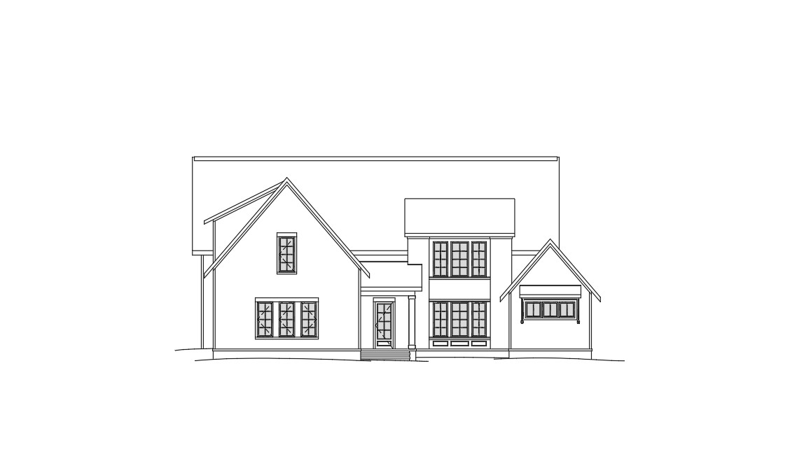 realistic render cloudy sky simple shrubs manicured lawn wooded background brick exterior stucco dormers