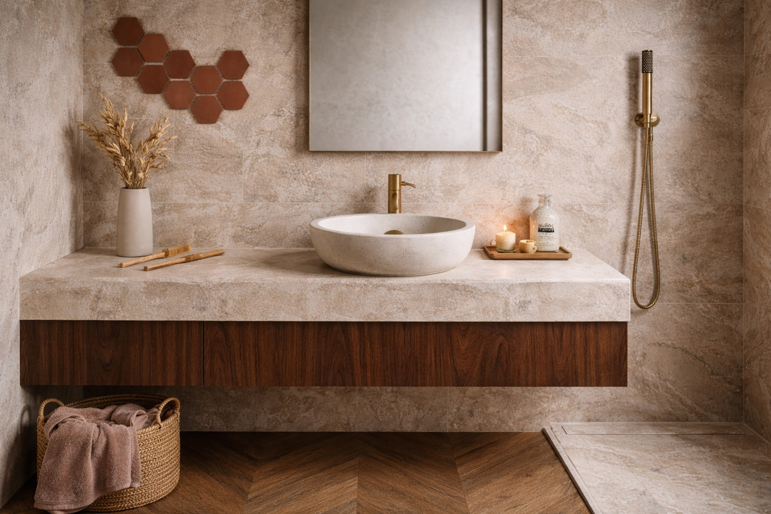 ultra realistic architectural bathroom interior minimalist european design calm balanced timeless large format beige limestone slabs minimal joints honed finish natural mineral texture floating monolithic stone console thick slab sharp geometry precise craftsmanship dark walnut floating vanity below flat fronts no handles horizontal grain alignment single white mineral vessel sink refined geometry subtle texture integrated brushed brass wall mounted faucet matte finish minimal reflection large frameless mirror spanning almost entire wall width walk in shower with invisible drain frameless glass wall integrated shower system hidden lighting only soft ceiling perimeter glow subtle under console shadow gentle wall grazing light no decorative clutter no visible accessories architectural calm true to scale realism natural color grading no cgi gloss