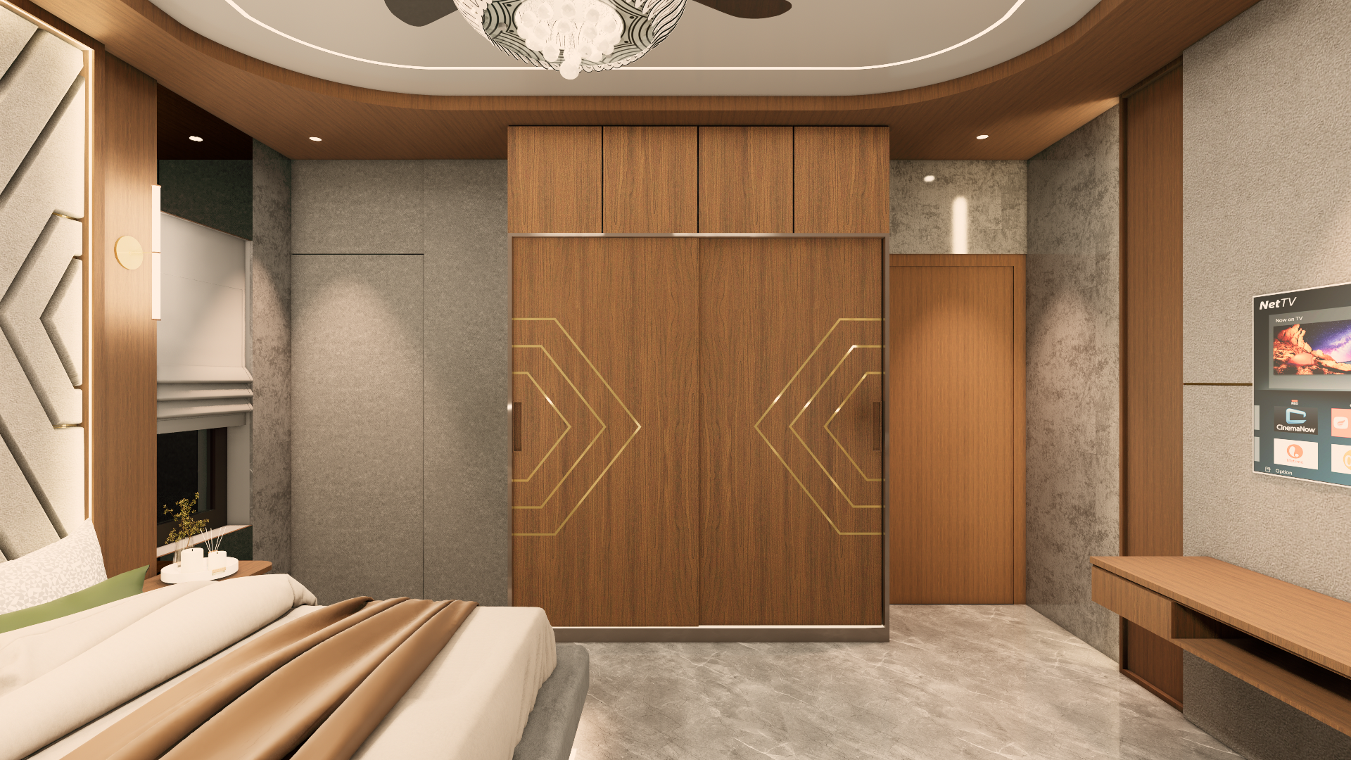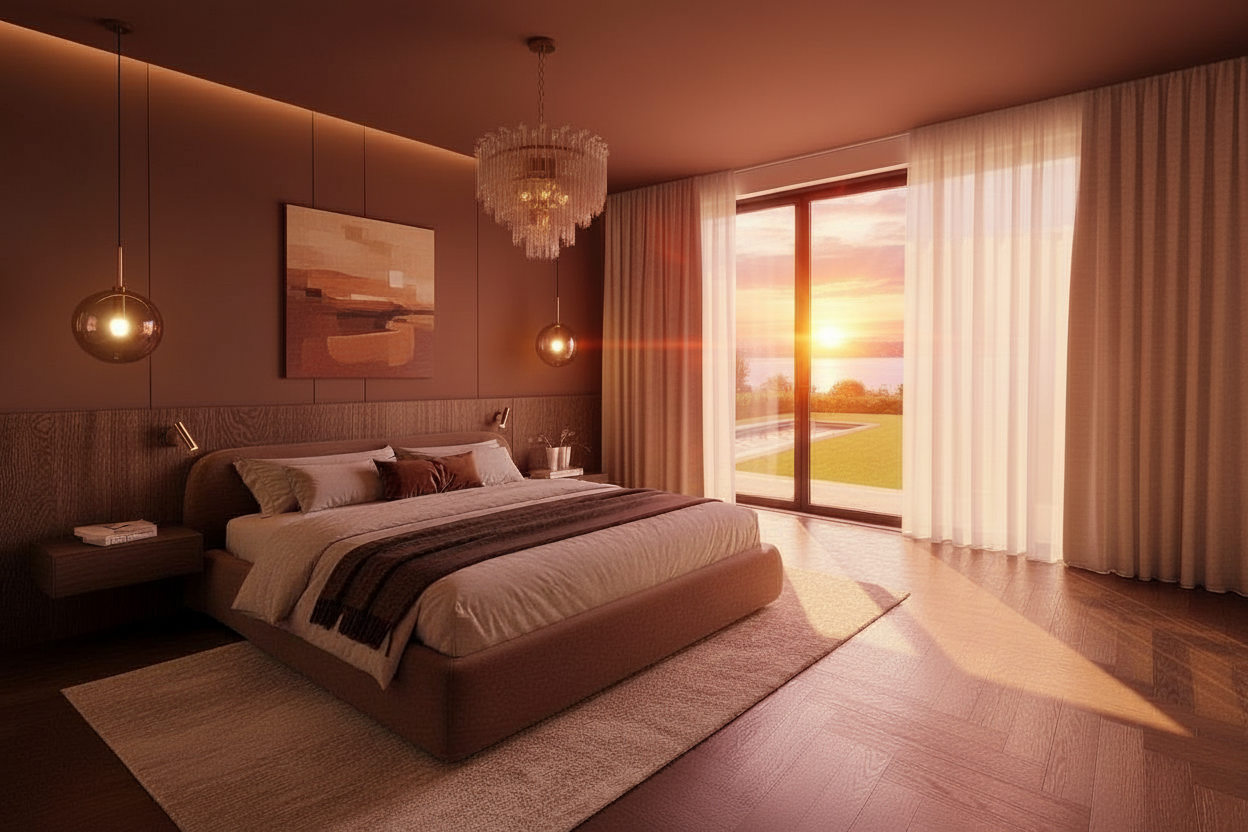make changes in colors if required to the room with the color pallete walnut wood medium and dark grey beige and brass metal and let the room look dark but cozy and make it look realistic