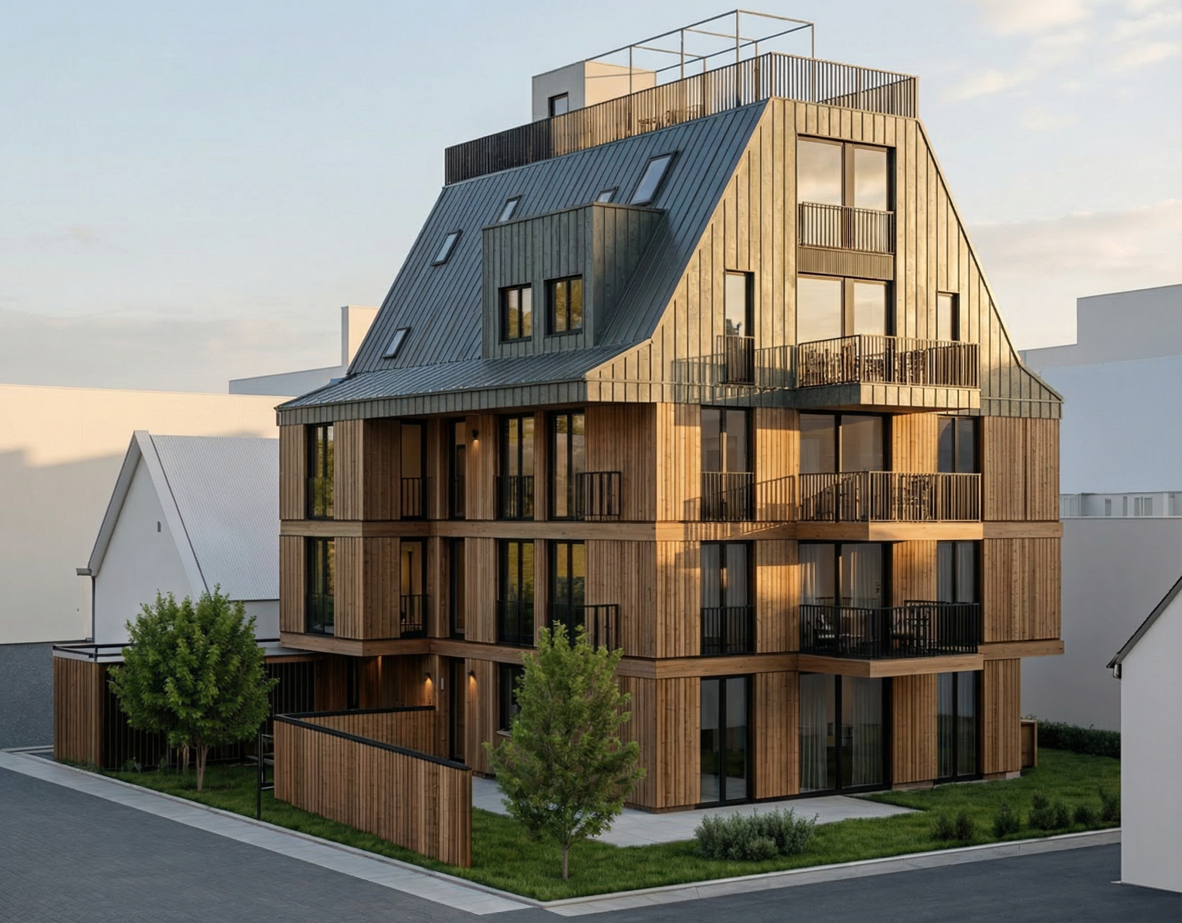 details take them as show in the picture scene type residential house image style photorealistic architectural style modern mood sedate materials roof and front facade in the roof area copper railing metal dark black windows dark black facade wood vertical structure as in the picture colour brownish textures facade spruce colors soft colours lighting natural show all sourding buildings with a soft touch in a darker grey get back to the last version reference image take the coloursceem of this picture and use it for the visualisation image size dont cut anything away