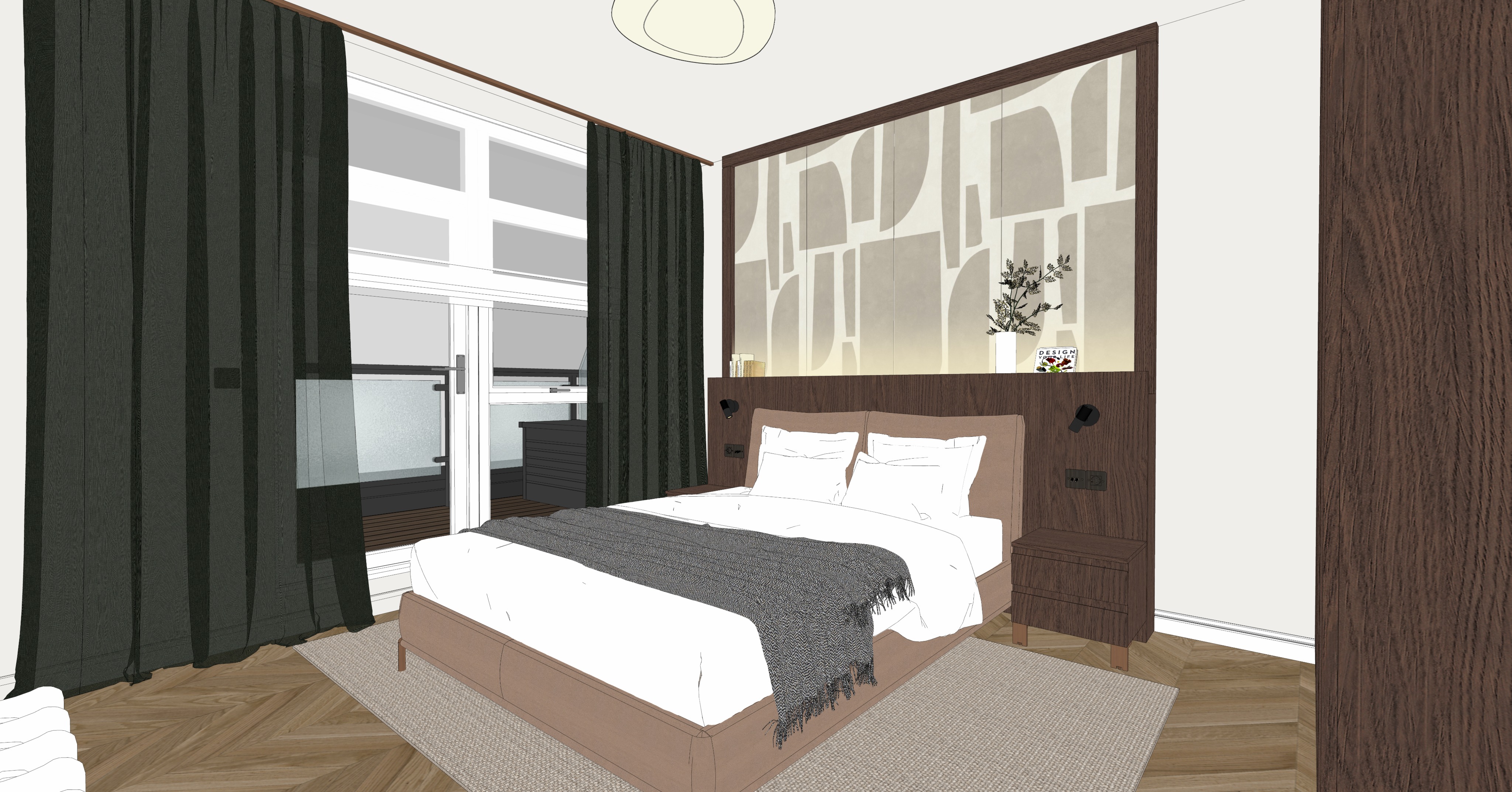 preserve my view create a realistic daylight render preserve all materials and textures as they are keep the white fabric ceiling lamp as in the sketch with the fabric slightly transparent make the floor a bit lighter preserve green linen night curtains