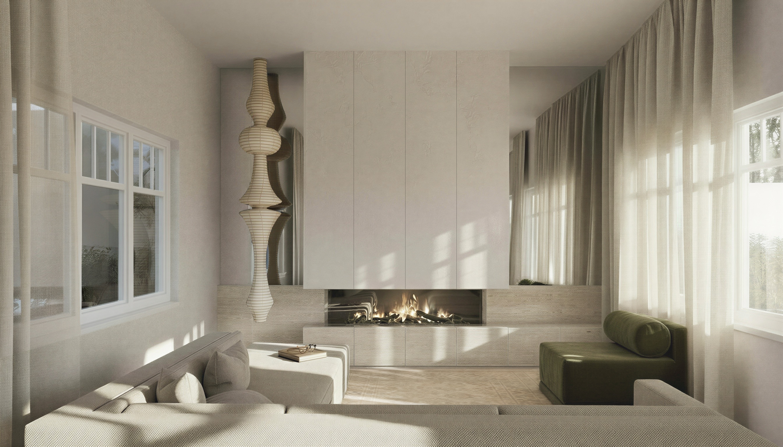change the window frames and sills to a walnut timber finish everything else remains the same including the lighting