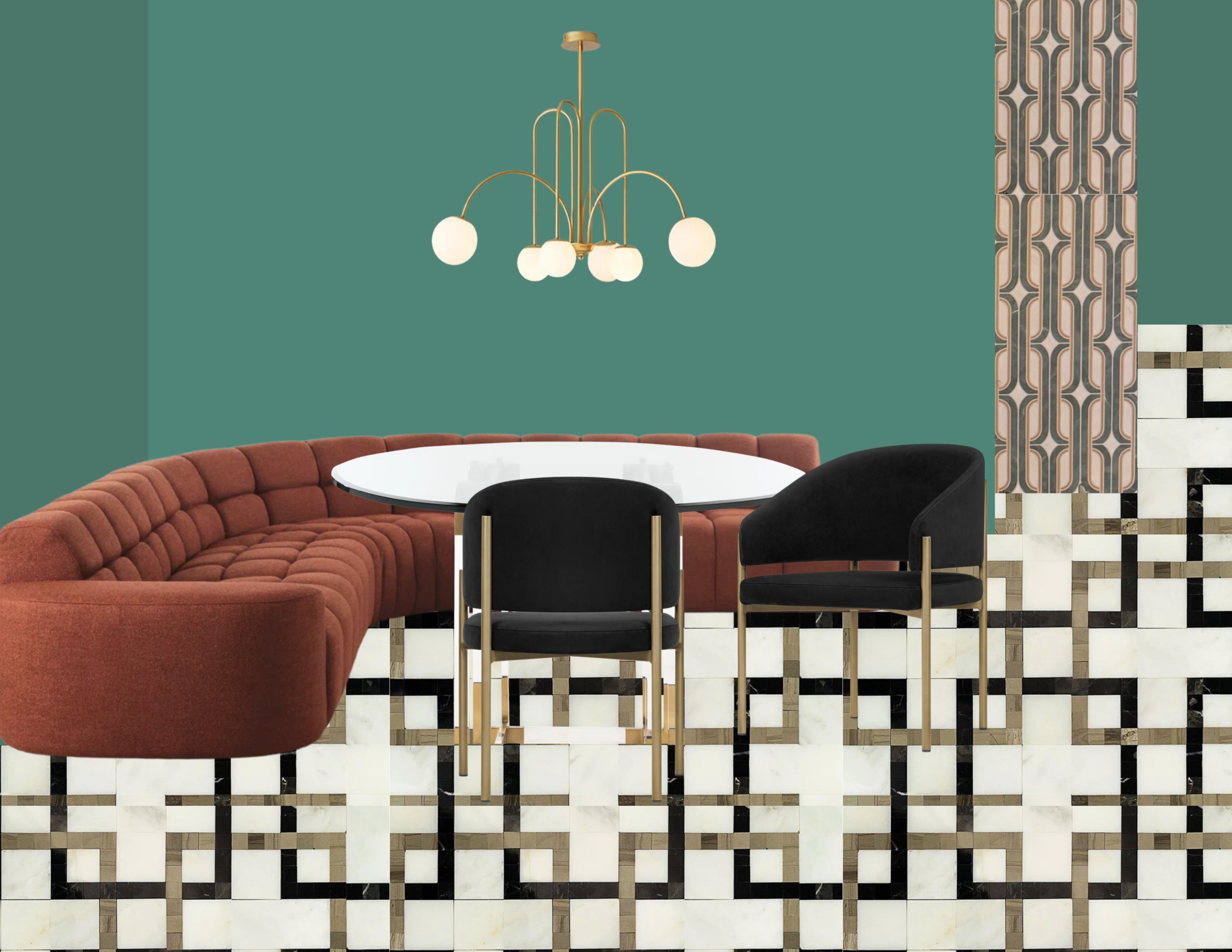tall long windows on the left side wall coffered ceilings in the same color as the walsl vertical tile on the right hand side is to be the profile view of a modern tiled fireplace that goes straight up and down and is around a corner wall