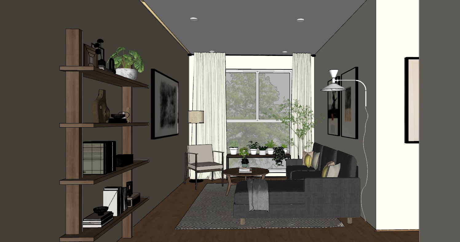 photorealistic interior rendering of a modern warm minimalist living room maintain the exact camera angle framing proportions and full composition from the original reference image do not crop or cut off the l shaped gray sofa it must be fully visible within the frame including both sections of the l the space features a narrow layout with warm toned wooden flooring and a clean white ceiling with recessed spotlights the walls on the right side must be a soft beige color while the wall on the left side must be in a slightly darker beige tone with a subtle brown warmer hue on the left wall include a wooden shelving unit with decorative objects such as books vases and plants at the back include a large window with sheer white curtains allowing soft natural daylight to enter place indoor plants near the window but remove the extra plant located behind the chair on the left side keeping only the intended vegetation in front of the sofa include a light colored textured rug a round coffee table and a small ottoman add a modern floor lamp with warm light on the right side next to the sofa lighting adjustments remove completely any integrated lighting or led strips from the wooden shelves on the left wall the shelves must not emit light and should appear naturally and evenly lit add a warm led strip light integrated into the ceiling plafond along the upper left side only recessed and subtle casting soft indirect light do not add led lighting anywhere else maintain a daytime ambiance with balanced natural light and soft warm artificial lighting corrections and cleanup remove the electrical outlet switch on the right wall leaving a clean smooth uninterrupted surface adjust the wall mounted lamp on the right so it sits flush against the wall properly aligned and touching the wall surface without floating and without adding any new base or extra elements ensure all surfaces are clean with no visual artifacts unwanted reflections or inconsistencies preserve all materials textures and colors exactly as in the reference image avoid distortions avoid adding or removing furniture except as specified and keep the scene visually consistent sharp and realistic do not alter anything else in the image everything else must remain identical to the original reference