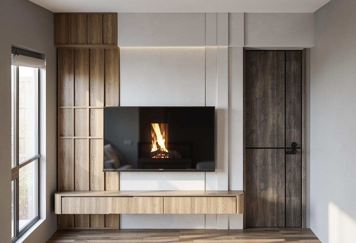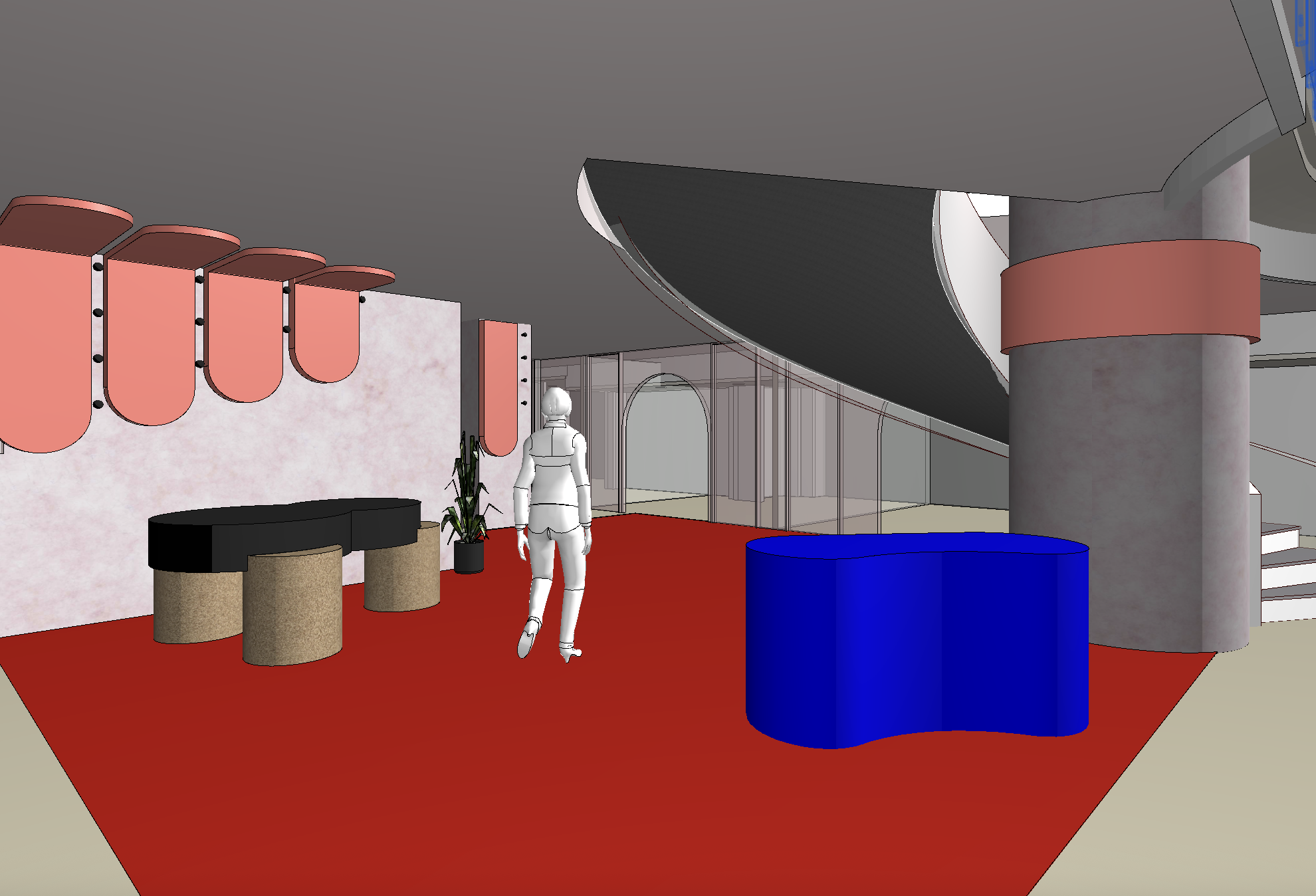show large format terrazzo tiles where the red floor is show textured sandstone where the yellow table legs are show a mirror surface to the black table top show pink marble where the pink marble texture is white stairs light pink glass to the consult rooms for the paddles shapes on the wall and ceiling make these coral laminate and show the light bulbs that are between them currently in black as warm illuminate bulbs replace the person with a real life looking female replace the plant with a real looking fiddle leaf on the large coral ring located on the round column show a curved neon sign saying beauty in lower case letter