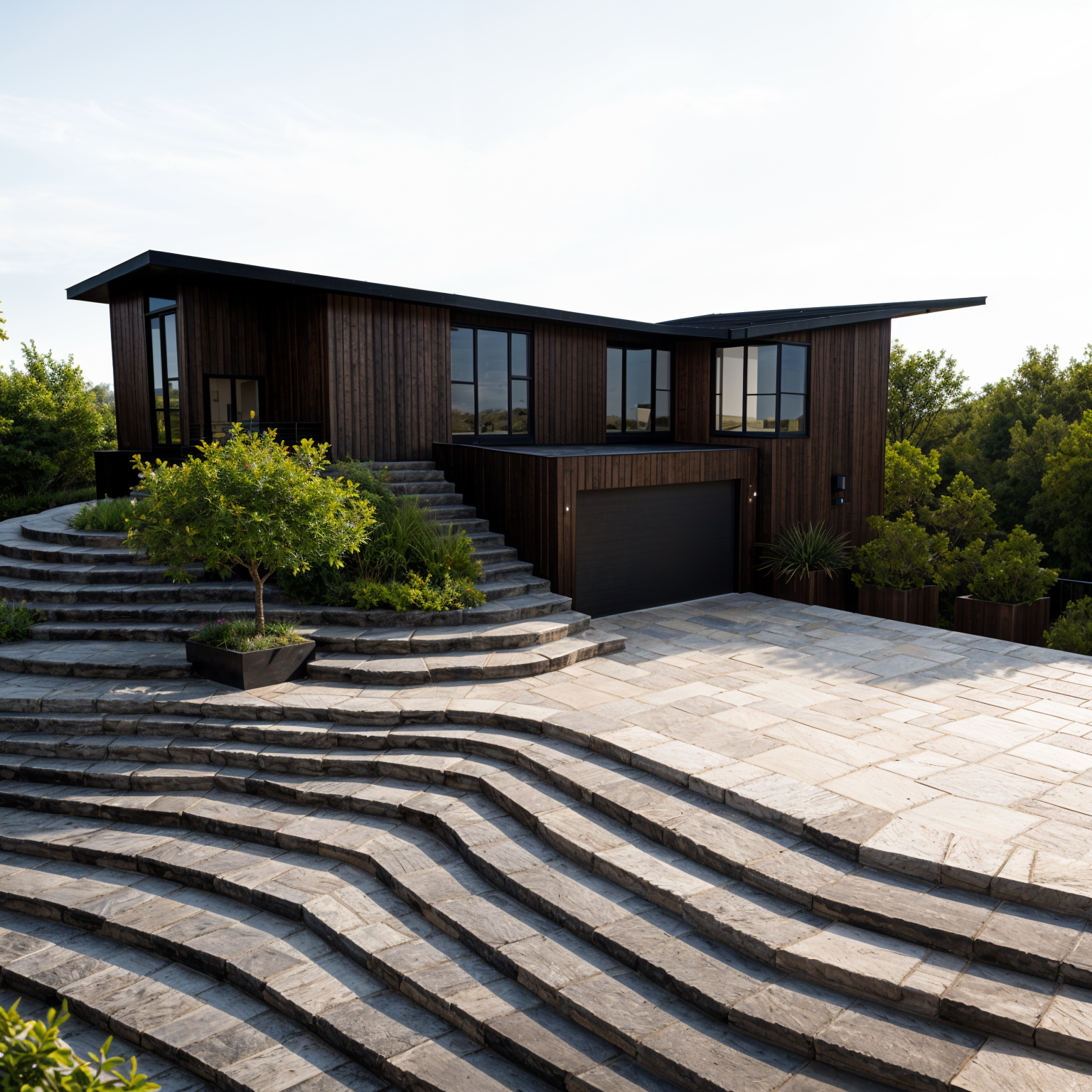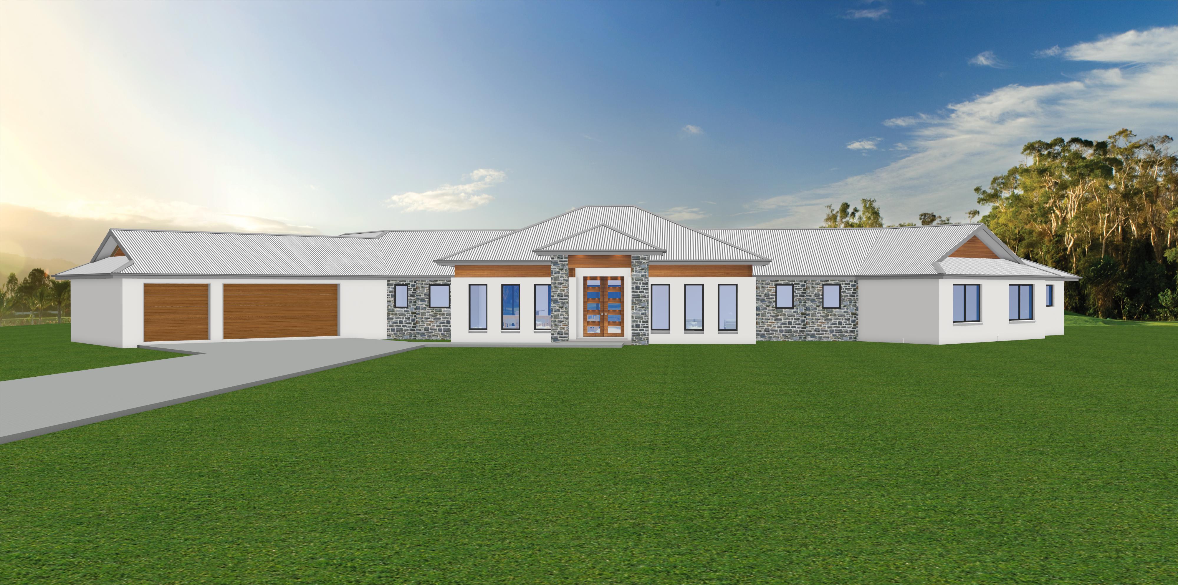 grass lawn to front with some feature landscaping bush backdrop semi reflective glass windows daytime light plain grey driveway