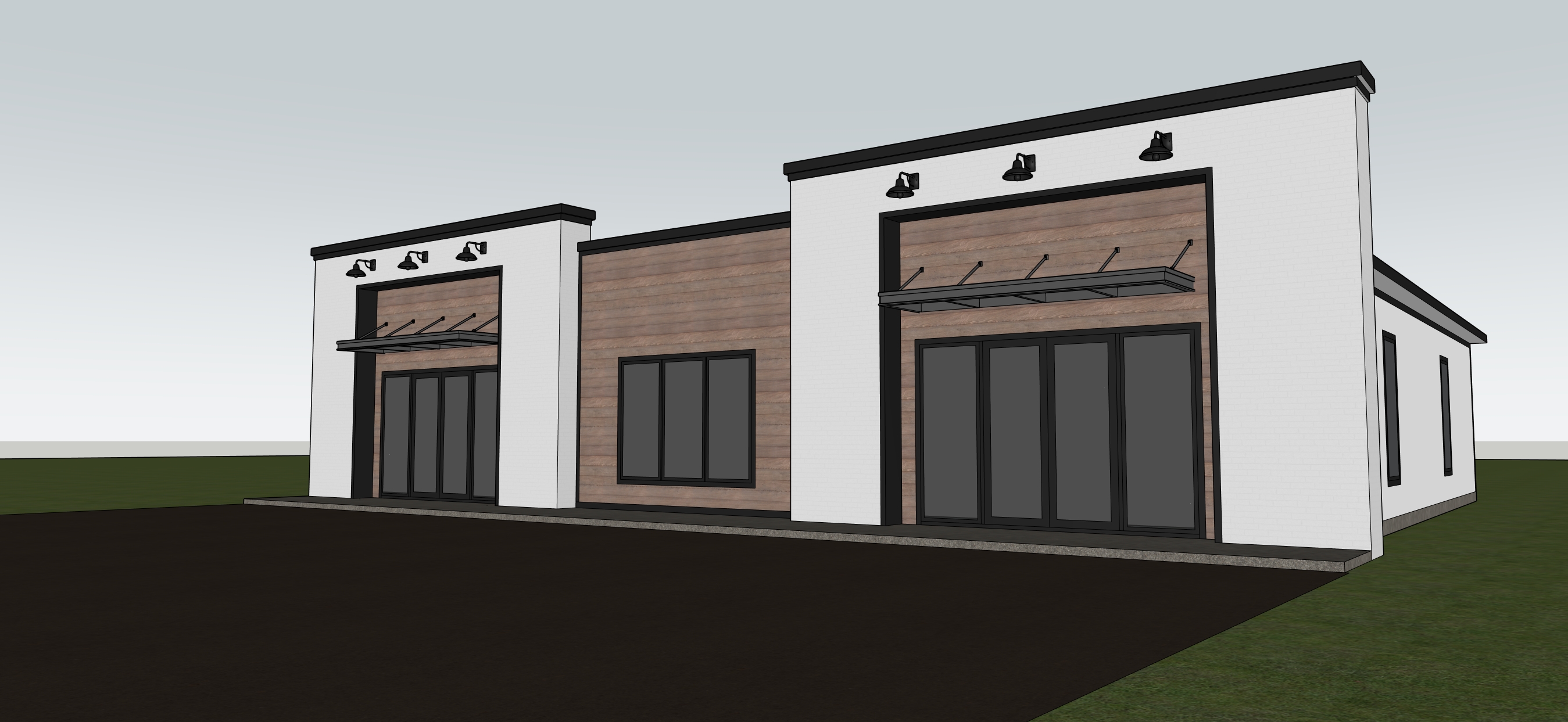 add cars in parking lot add landscaping add trees in background make realistic