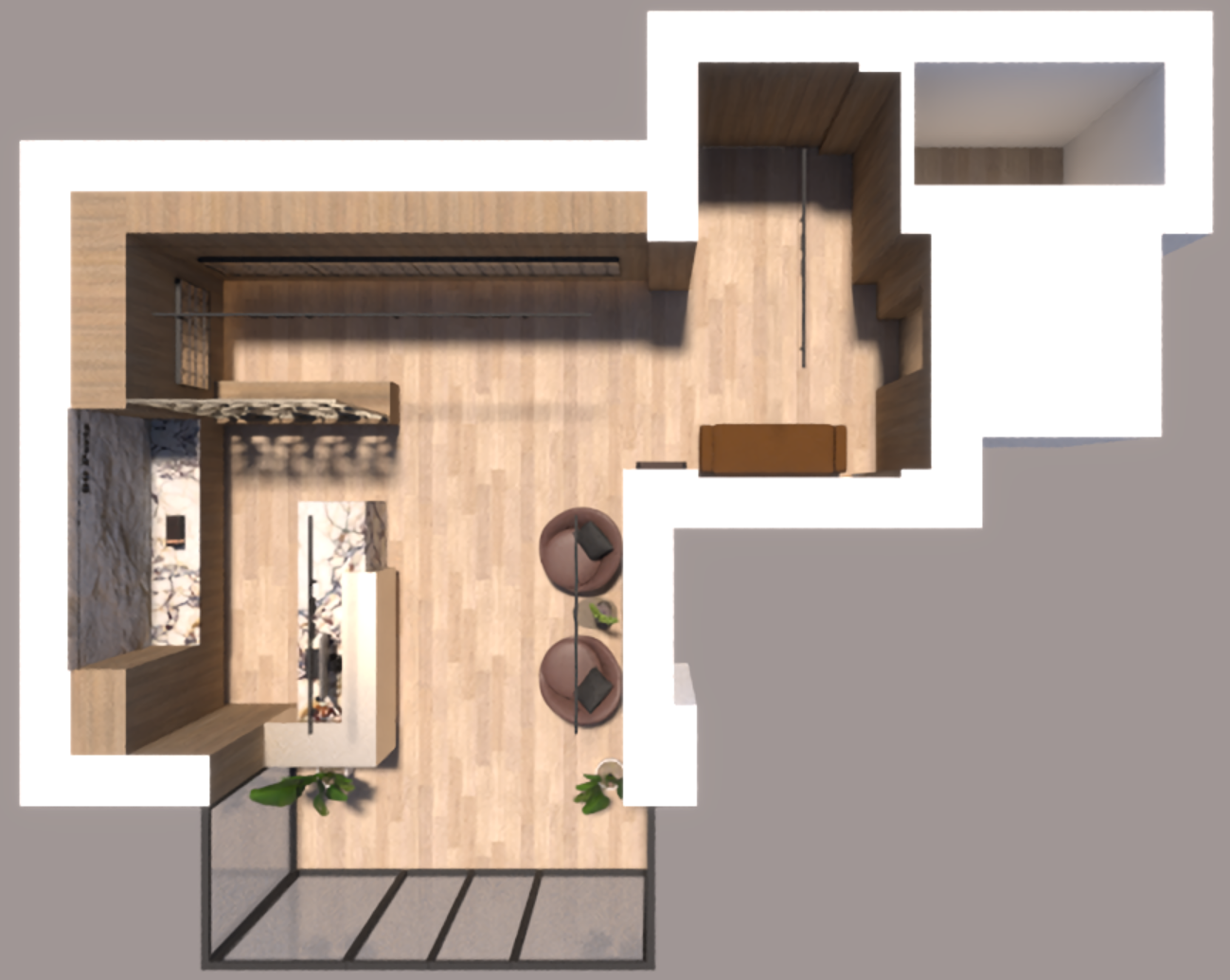 render a cozy modern hotel lobby with soft ambient lighting this is top down 3d view use light oak wood floors and dark wood for cabinets and shelves reception desk features a marble countertop and backsplash with rough stone cut maintain a warm inviting atmosphere with warm toned lighting grey area is outside of the building don t render