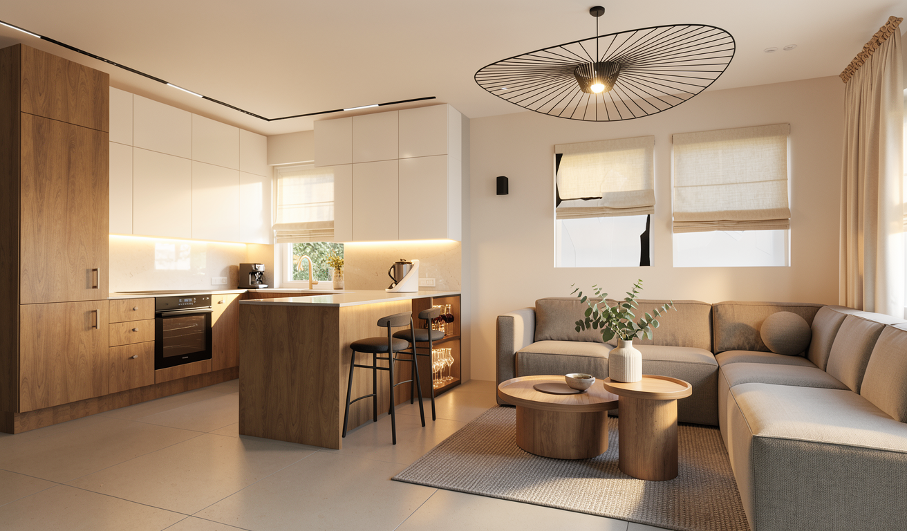 more light warm light and warm wood and glossy worktop japandi minimalistic style add warm light under the upper white cupboards add small cofeee machine on the worktop add a small japandi vase with eucaliptus leaves on a cofee table in brushed gold tray add inside in the cupboard near on the right side to the bar chair a wine glasses and fluted glass add light cream linen roman blinds only to the windows area