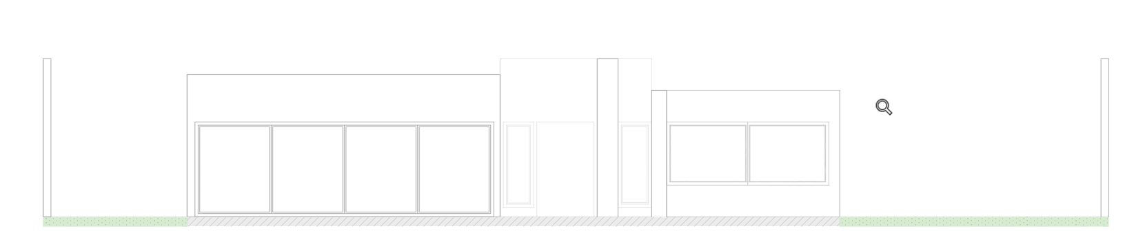 this is the front facade of a house the facade is composed of three parts on the left large format sliding doors of glass and black aluminum with a rustic concrete finish located in the foreground in the center is the main pivoting door of walnut wood with two black metal framed glass windows the wall finish is square clay lattices and it is located in the background on the right is the third part which is in the background with glass windows and black aluminum frames and the wall finish is wooden slats