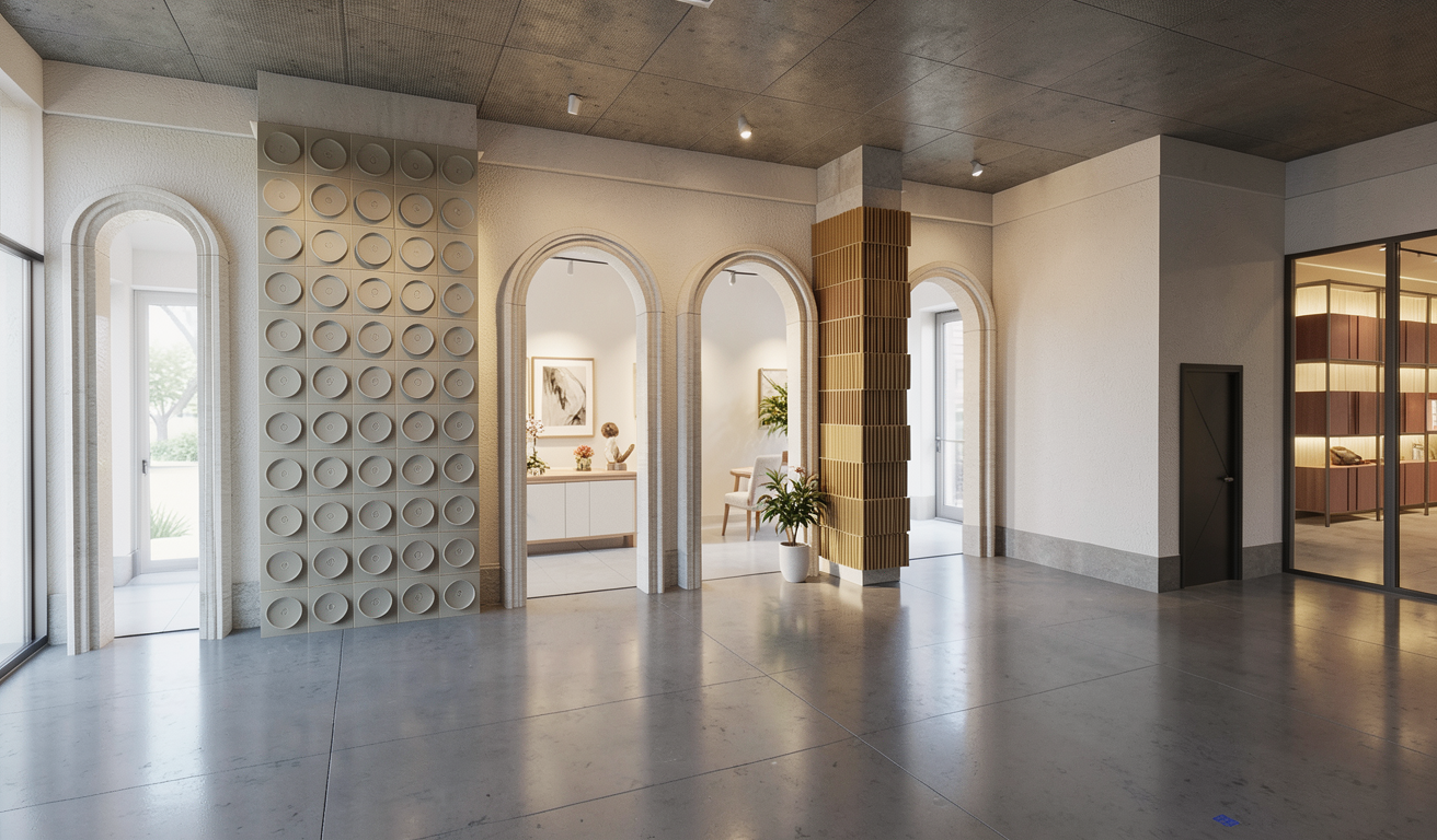 realistic terrace with natural warmer daylight pouf and pillow in brown velvet flower pots in dark grey with structure realistic background clear water bottle and glasses table lamp is slightly on lamps inside are off keep textures and proportions