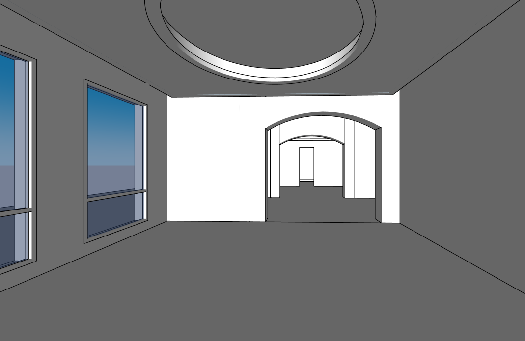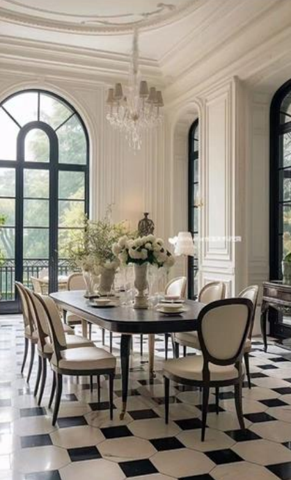 exterior shot create a beautiful interior scene with modern architecture without changing the arquitectural structure of the space the walls are crisp white with flooring in square in wood and with porcelain the large windows with black rectangular frames display a serene gradient sky transitioning from a rich blue to a soft twilight hue casting a calming ambiance throughout the room the atmosphere is clean open and inviting with soft natural light diffusing gently across surfaces encircle the ceiling fixture with a subtle halo effect enhancing the elegance of the space add a touch of minimalist decor for a contemporary and sophisticated feel
