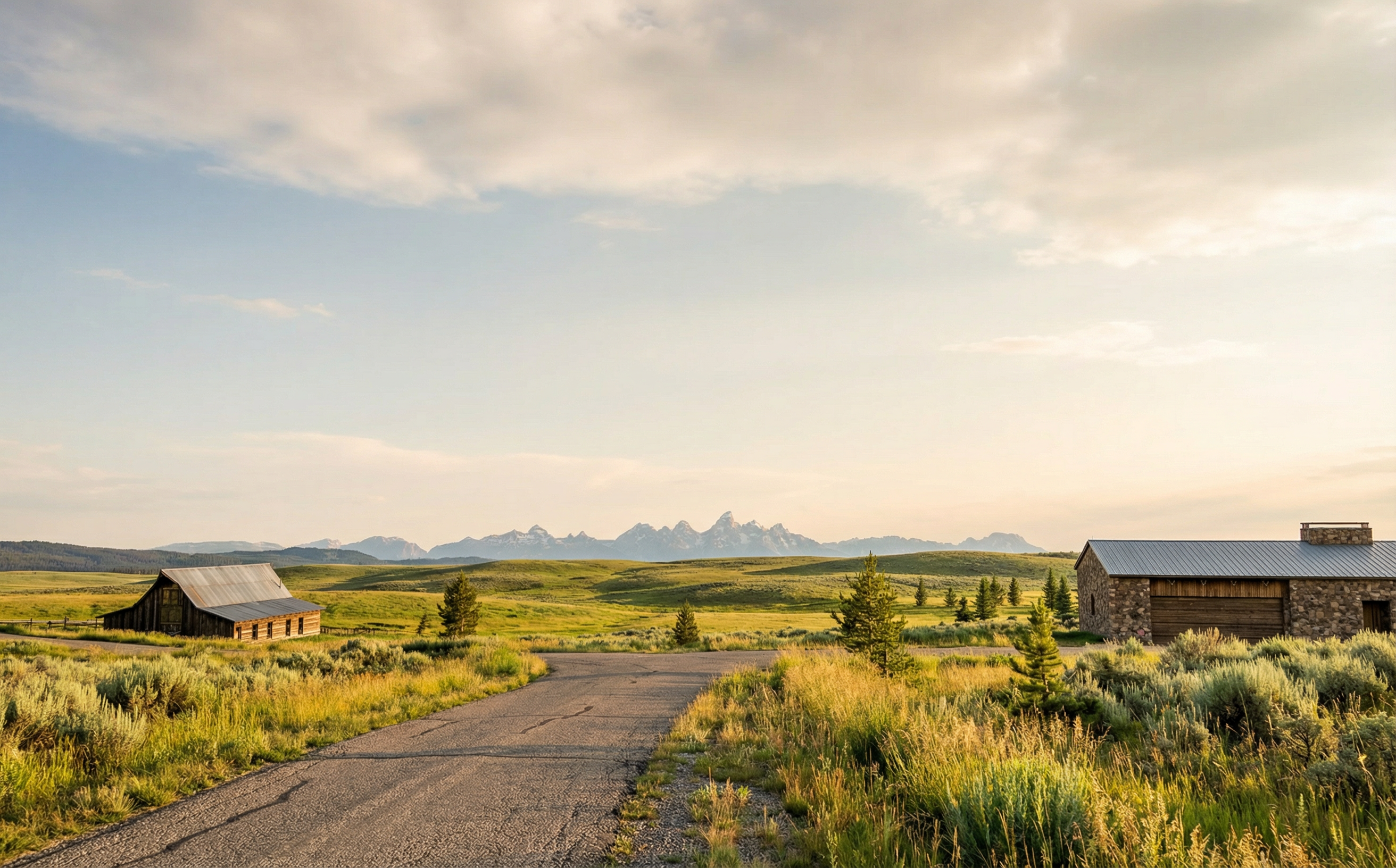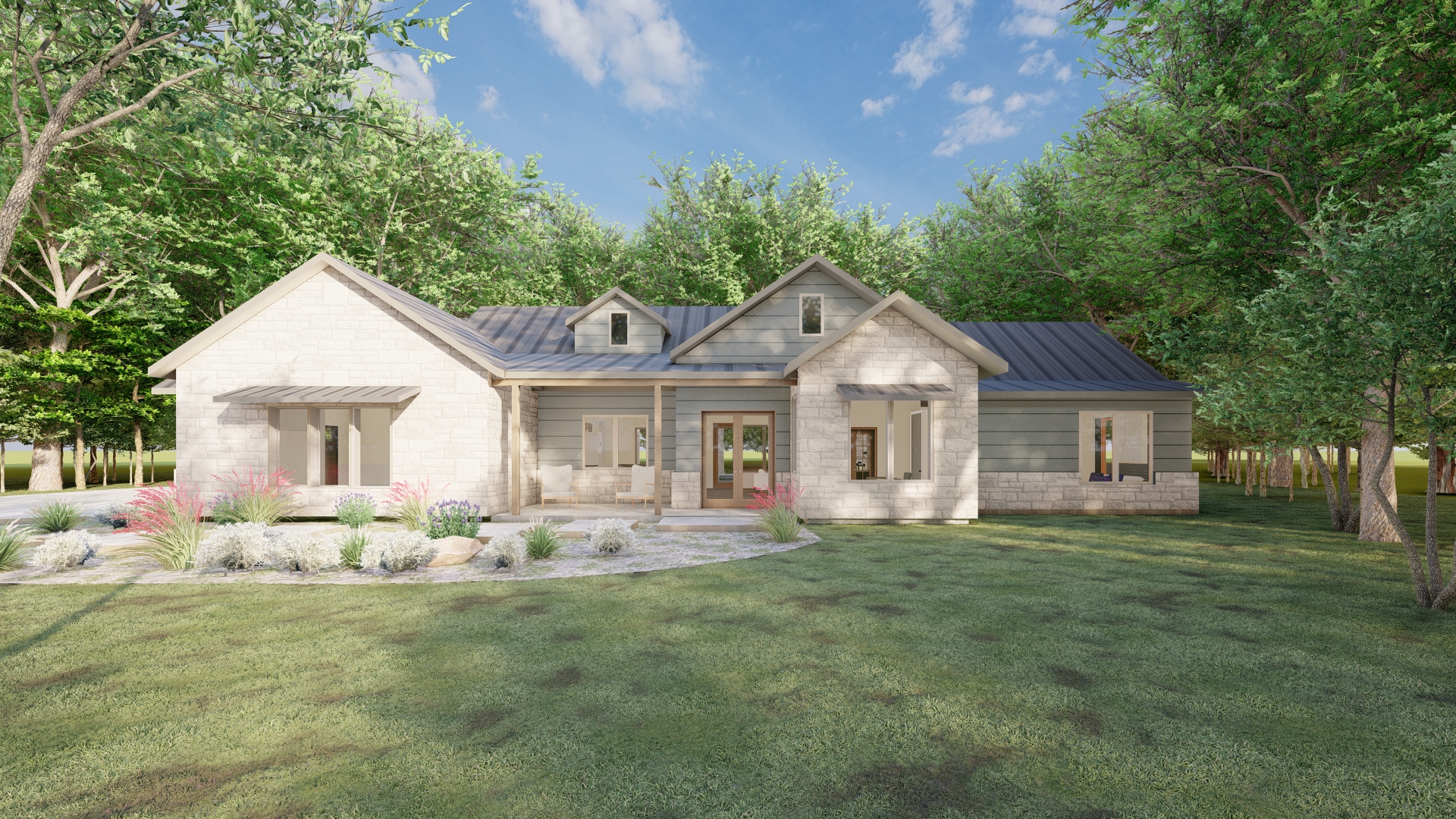 make this more realistic enhance the materials daylight and airy atmosphere with clouds the lights are dimly visible through the windows the environment is central texas with trees and a residential fence more modern feel