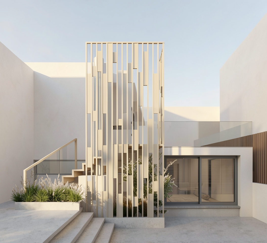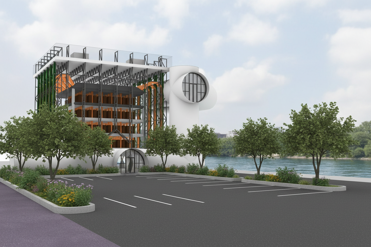 create an photorealistic architectural rendering of this building do not change any geometry place a small parking lot in the gray area along the bottom add lots of landscaping and foliage in the parking lot as well the purple is the asphalt from the street the blue in the background is a river that flows past the building add a set of doors and windows to the circular opening in the middle of the white tube keep the doors and windows within the circular cut out the upper circular cut out needs to remain as glass
