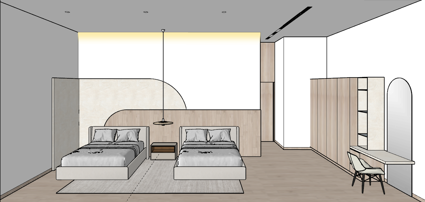 modern bedroom interior two beds with soft gray linens light wood headboard and flooring minimalist design calming atmosphere neutral beige and white walls smooth lines sleek hanging black pendant light warm ambient lighting elegant light wood wardrobe and desk area with a stylish chair large arched mirror soft cozy texture on rug overall serene and inviting feel