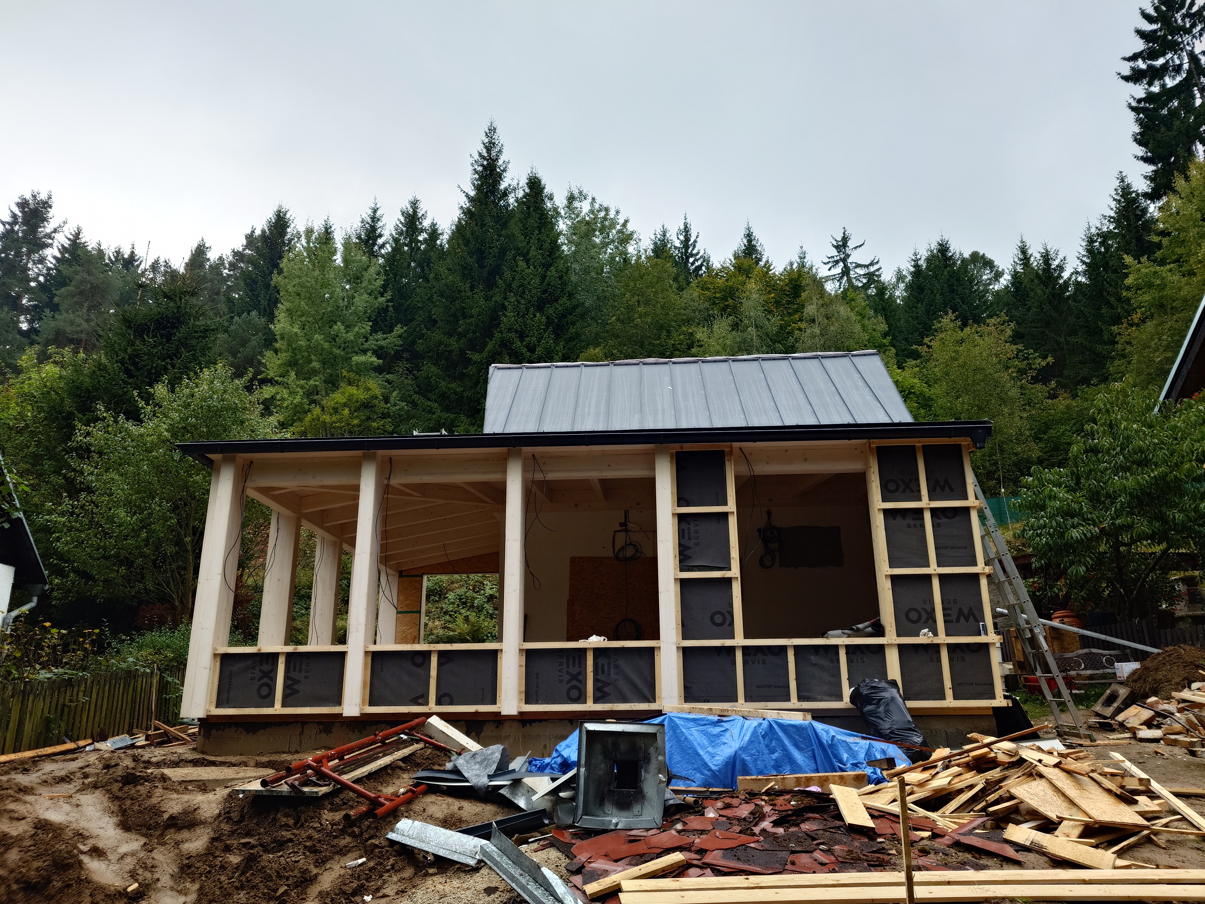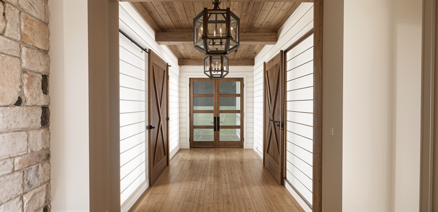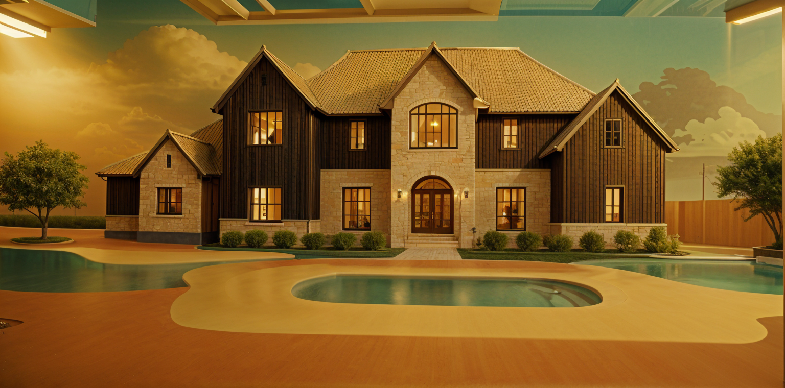 bauhaus exterior shot add grey double with no horizontal divider windows to openings add facade from vertical wooden stripes same colour as beams add cottage interior add grass in front architecture