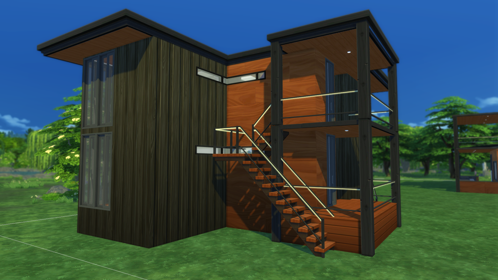 the exterior of the home is in a black vertical board and batten style siding the home is surrounded by spruce and pine trees add golden hour lighting