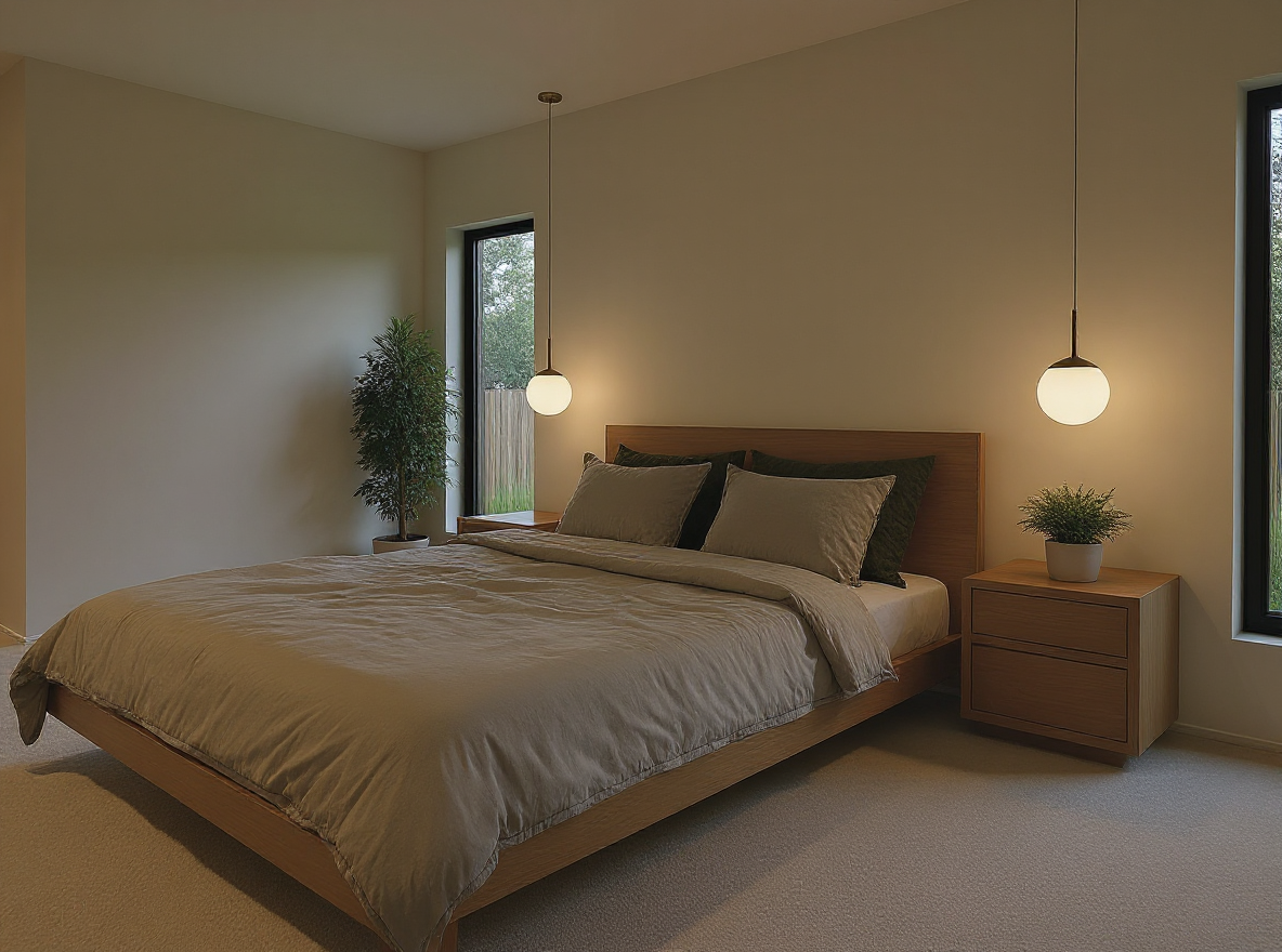 this is an existing modern ranch style home located at 3712 e pasadena ave phoenix az 85018 the landscaping is a lush green front yard with flowery plants along the building wall and two large trees in the front yard the exterior is a smooth light gray stucco under the gales at the left and right ends of the structure and the courtyard low walls adjacent to the right side of the garage the sectional overhead garage doors and main entrance front door to the house are a contrasting charcoal gray adding depth to the facade the natural river rock wainscot base at the middle section of the house features a variety of beige and gray river rock wainscot with white board batten siding above the windows are white frames and have slightly reflective neutral glass with divided lights the driveway and walkway are paved in light gray concrete with a broom finish texture the atmosphere is a warm arid climate and inviting under a bright clear blue sky with sunlight the front elevation faces the south provide street scape matching local address