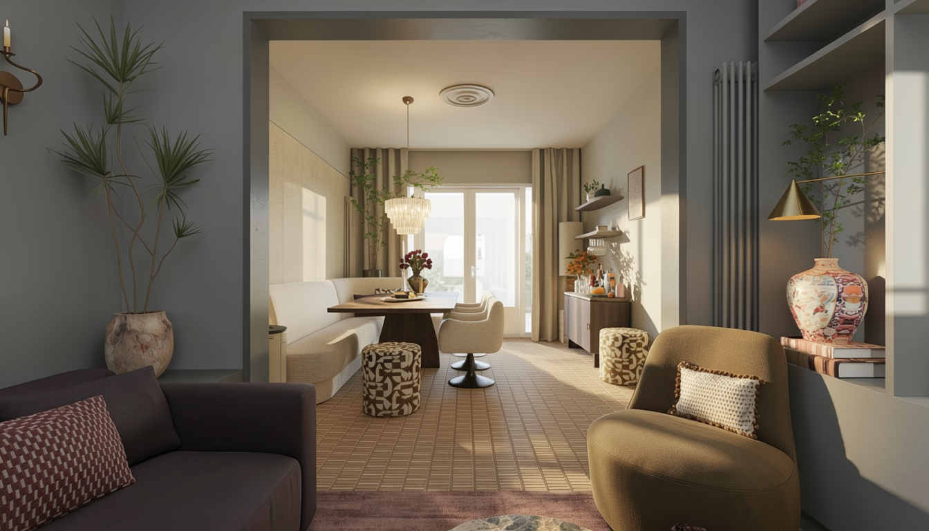 vykresli komody v b l m lesku pod l zadn st ny m stnosti jako se 3 z suvkami vykresli nad nimi men modern abstraktn obraz zm barvu vzoru na ubruse j deln ho stolu na jemnou st b it zlatavou v zu s r emi ponechej