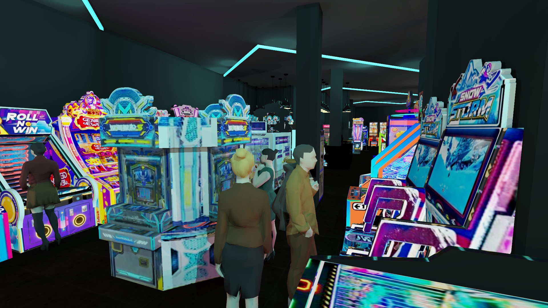 an arcade and gaming hall black walls and a black ceiling dark carpeting covers the floor colored light lines line the ceiling and colored lighting under the furniture make the image hyperrealistic