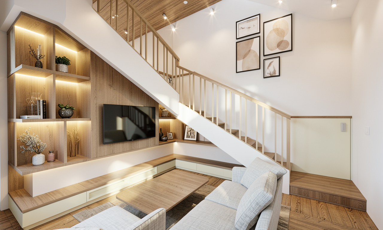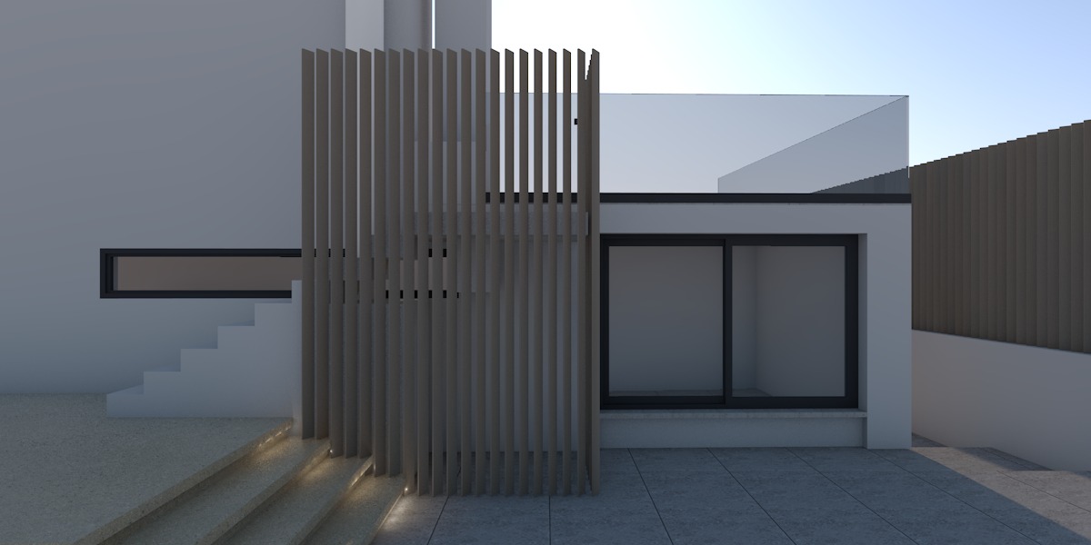 a calm and atmospheric architectural scene with a soft refined ambiance the walls are painted in a warm white tone creating a clean and inviting base the vertical slatted elements on the right side as well as the aligned surfaces are finished in a subtle beige color adding warmth and texture to the composition the window frames are in dark charcoal grey aluminum with a matte finish providing a strong contrast against the lighter wall tones sheer curtains are visible from the interior softly diffusing the light and enhancing the sense of calmness above the window there is glass panels are installed contributing to a modern architectural identity and allowing natural light to filter through on the far right side beyond the linear railing elements there is lush greenery with trees and dense vegetation out of the building you only see a far view from them lighting should be soft and natural preferably during late afternoon or early evening with warm light tones enhancing the beige and warm white palette the overall mood should feel serene minimal and elegant with a strong connection between interior and exterior keep the geometry as it is