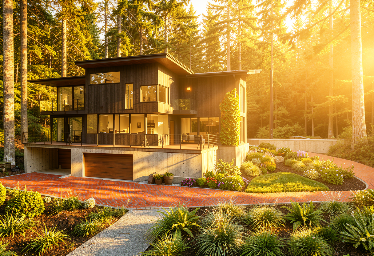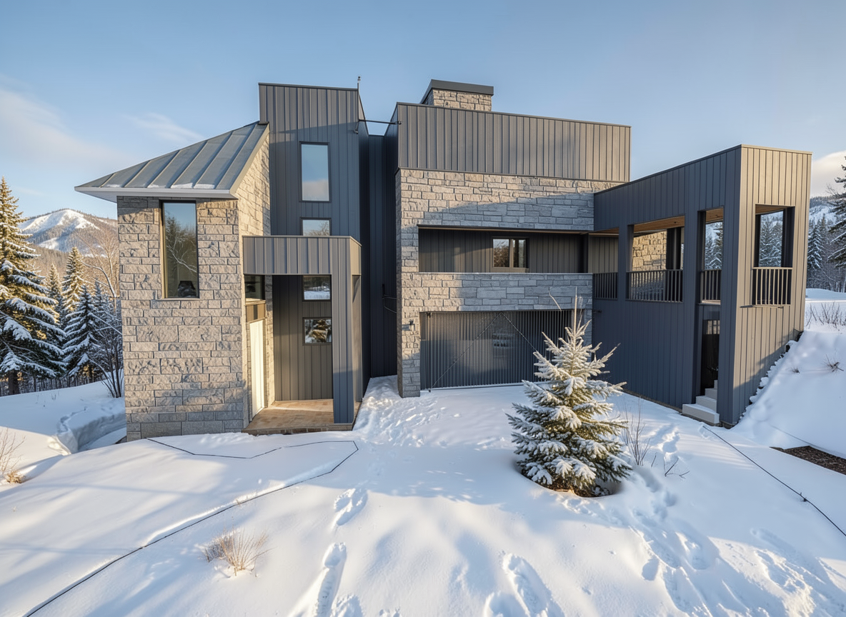 do not change the view enhance the current materials and make the landscape nicer vegetation generate with snow for winter conditions hyper realistic architectural visualization quality 8k resolution render a photorealistic 3d perspective of this house located in snowmass co reference the current material style just enhance material keep model geometry the same windows doors roof walls garage door pavement driveway make a lush vegetation that looks native to snowmass co