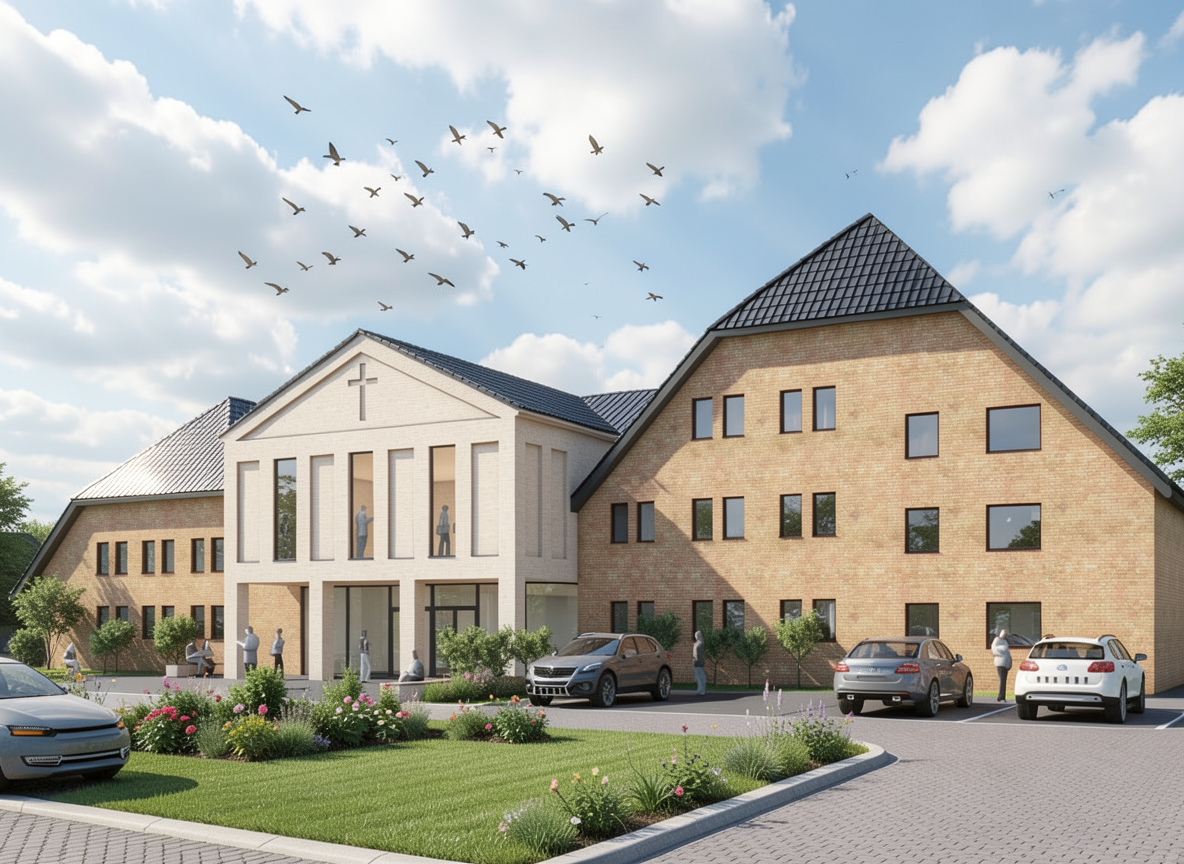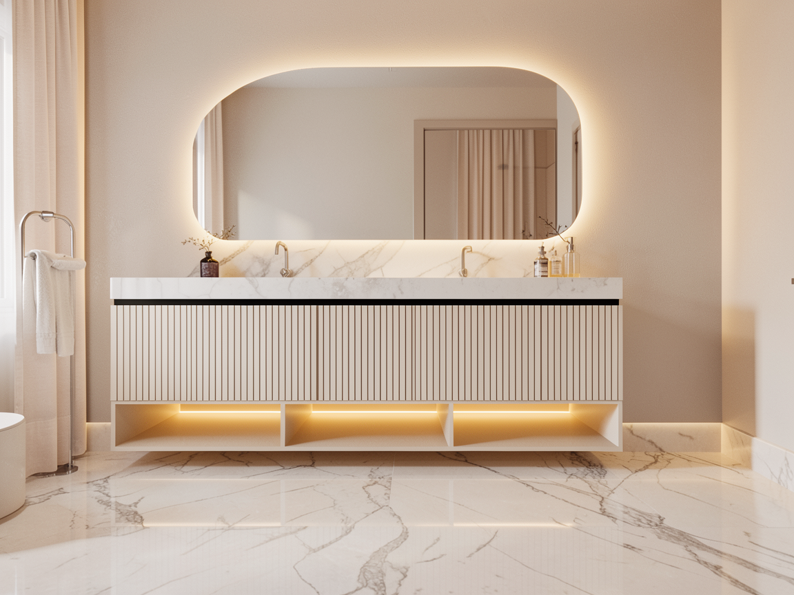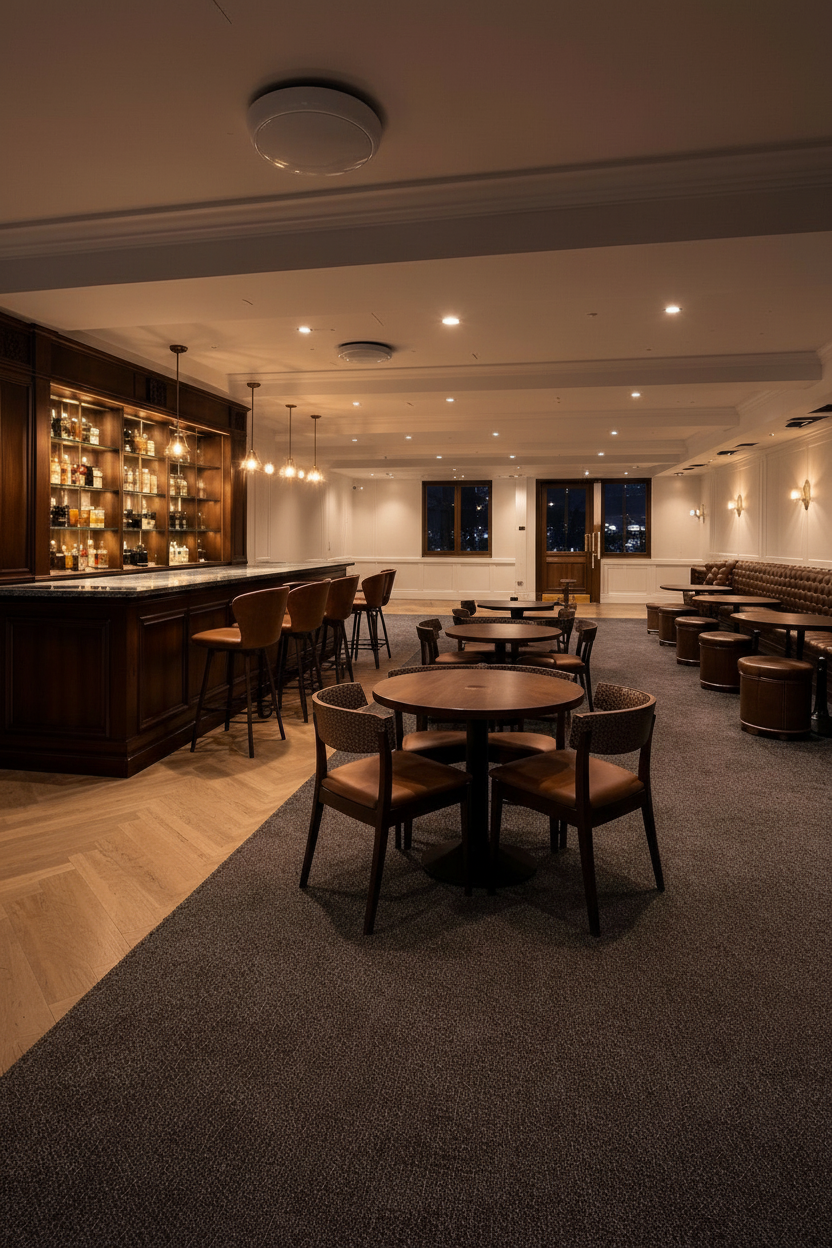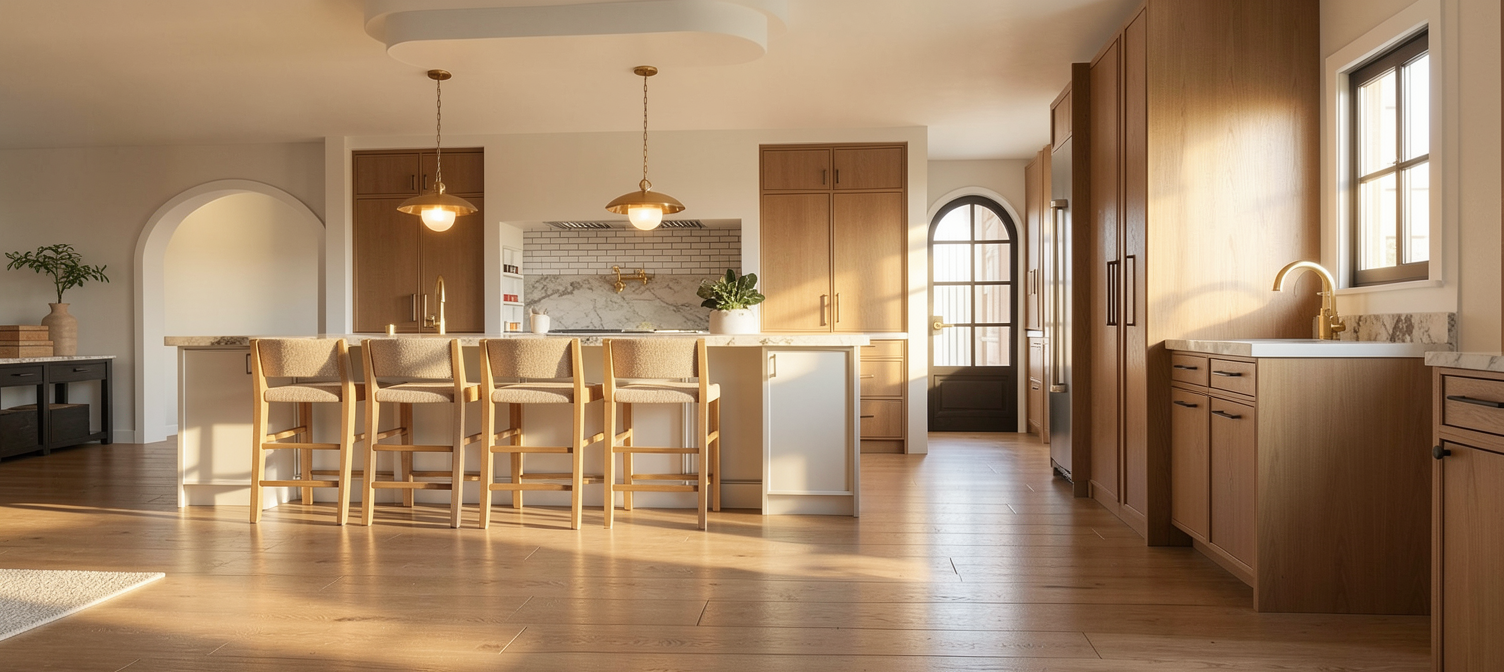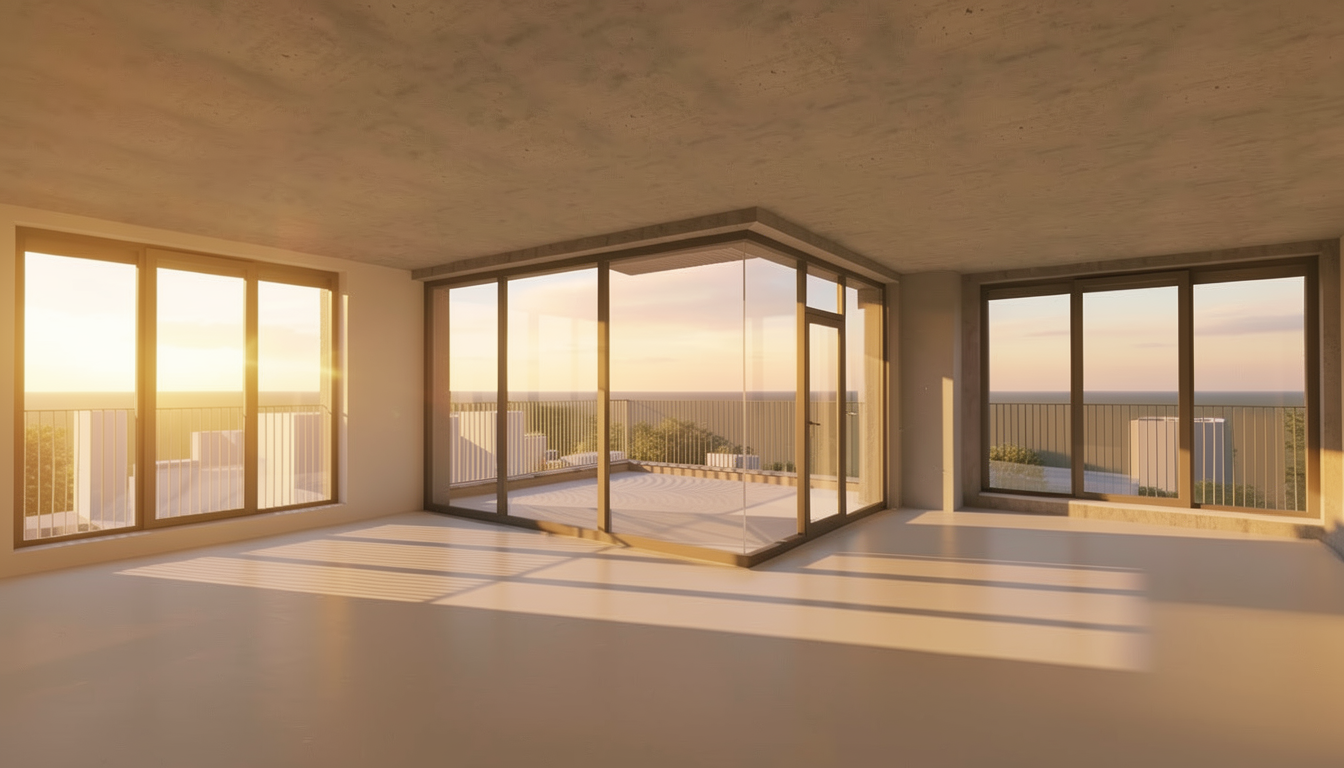 create a realistic architectural interior visualization while strictly preserving the exact camera position perspective room geometry window sizes and composition do not modify the architecture openings or layout set a warm summer sunset outside with golden sunlight entering the room through the windows do not change exterior dont add bilding volumes just few trees from above and adjust the lighting to a late summer evening atmosphere without seeing sun