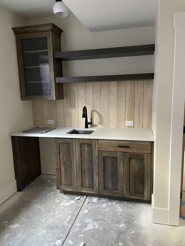 do not change the cabinets in any way preserve the exact cabinet colors materials finishes dimensions door and drawer styles hardware spacing alignment and all geometry exactly as shown do not alter the countertop shape backsplash appliances flooring lighting fixtures or wall structure only remove the construction materials clutter and mess from the scene clean the room and make it look finished and staged add a few simple tasteful home accessories appropriate for the style of the space but do not add or remove any furniture windows or architectural elements maintain the original lighting direction and realism enhance clarity and polish the photo while keeping the cabinetry and room design completely unchanged do not alter the lighting to keep the cabinet colors as they are in the image add new flooring put an undercounter fridge in the opening stage the countertop floating shelves and glass cabinet for a simple wet bar