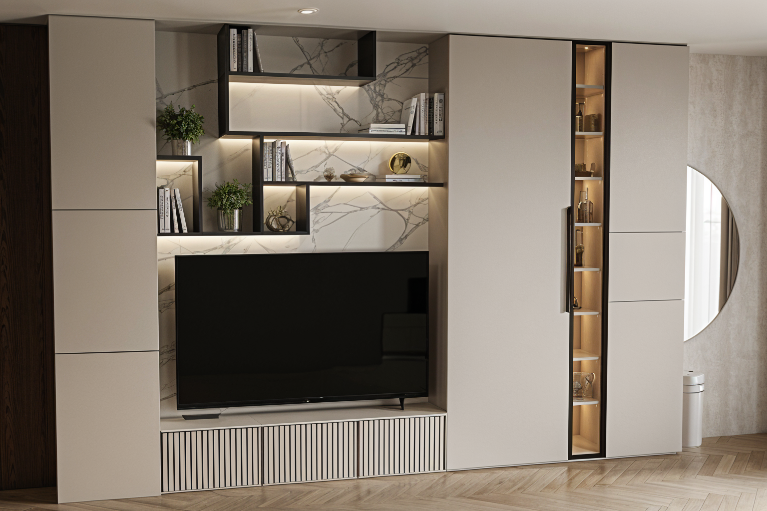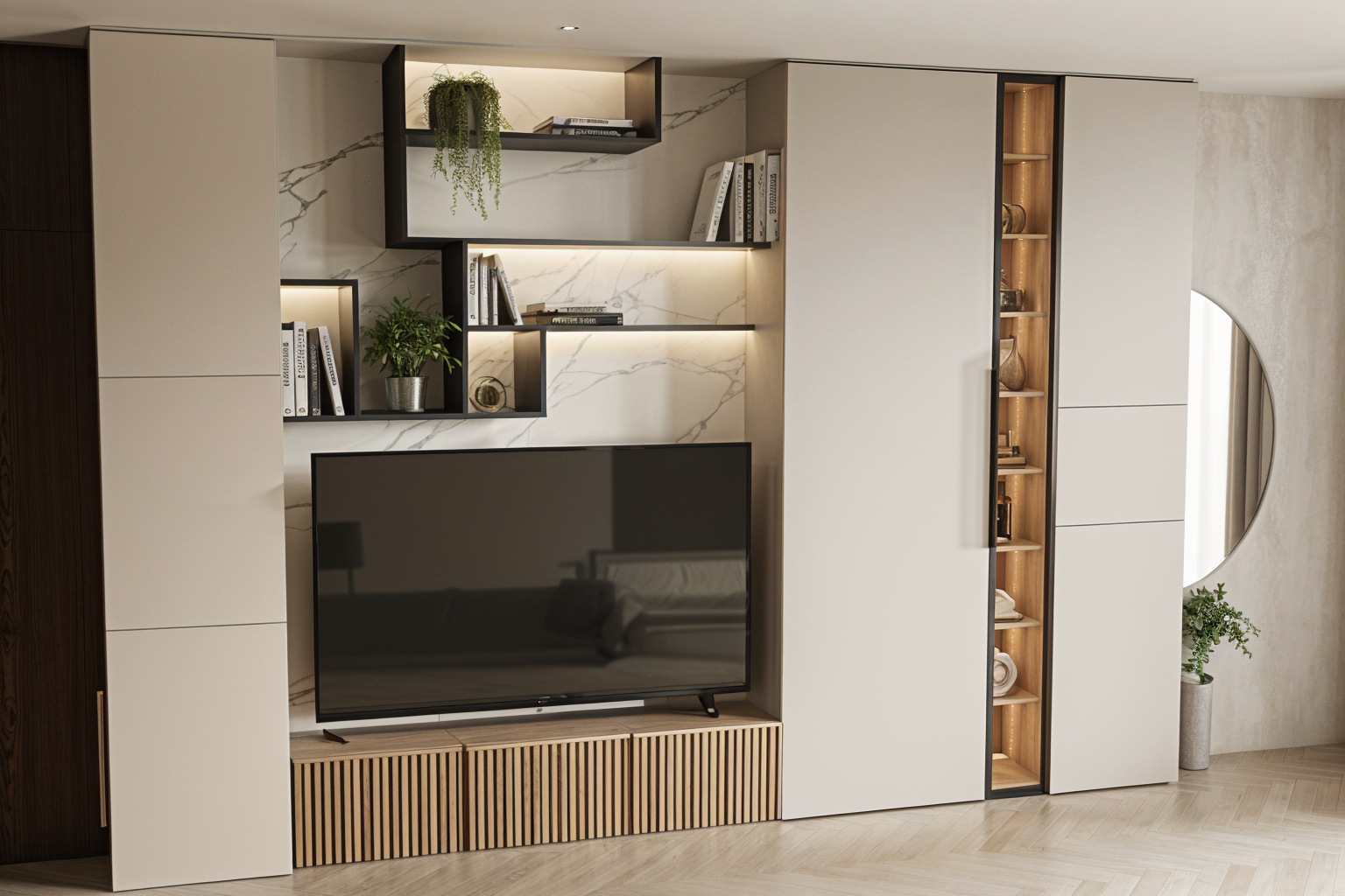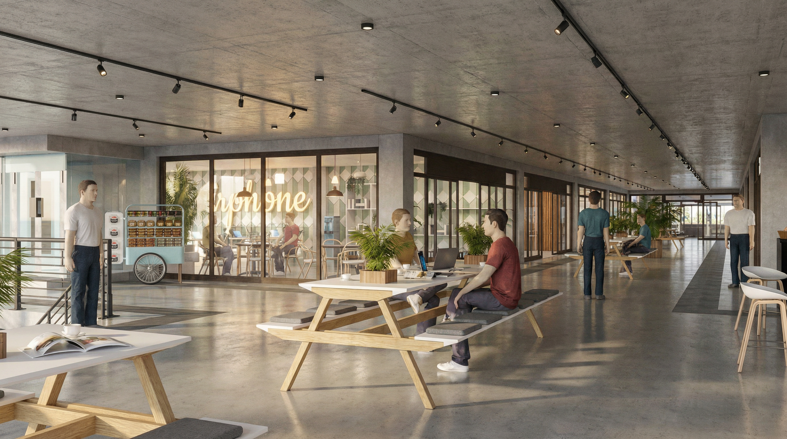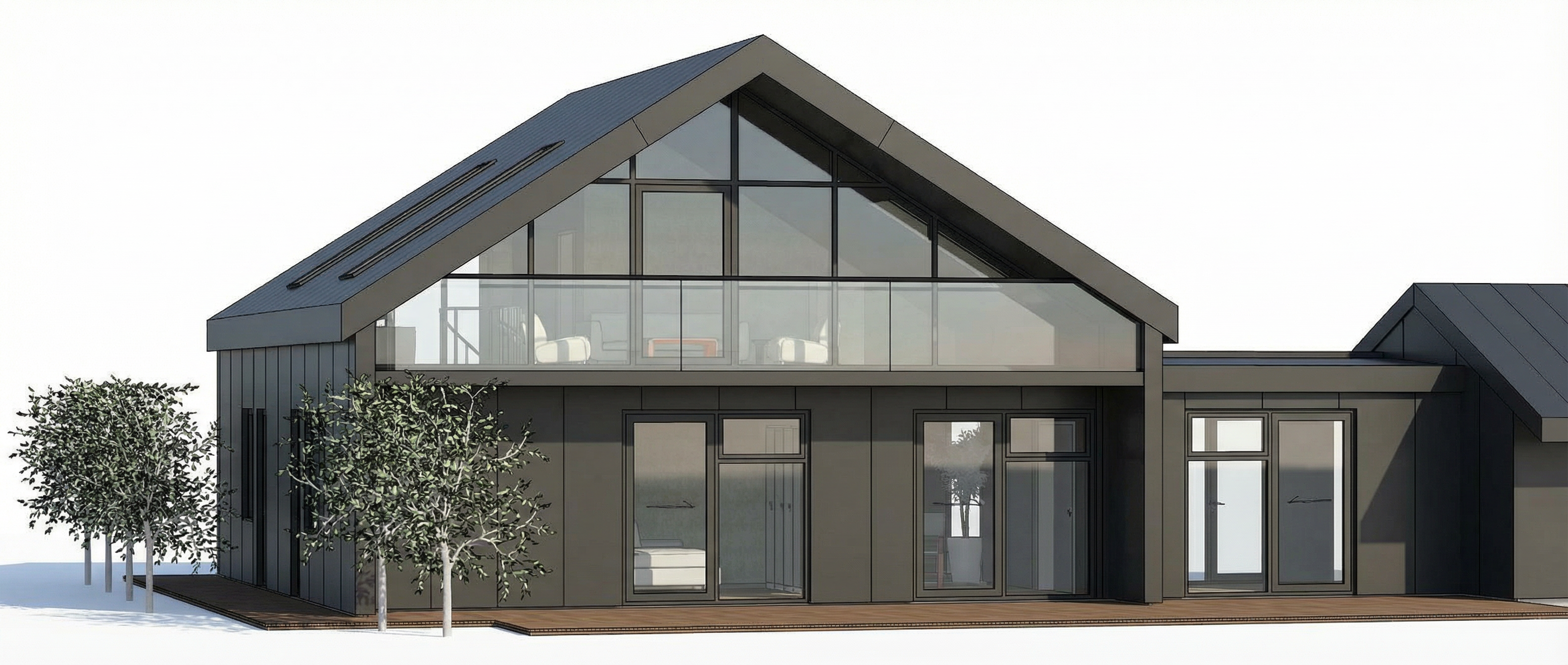aerial view of a modern suburban neighborhood featuring rows of minimalist white and grey plaster houses with flat gray bitumen roofs some of the roofs have solar panels installed the houses are neatly aligned each surrounded by lush green lawns and separated by elegant red boundary lines change red line to dark grey metal wire fences tall scots pine line the gray asphalt roads and grey and dark grey paving adding a natural touch to the geometric layout the scene is bathed in soft warm sunlight creating a serene and harmonious atmosphere