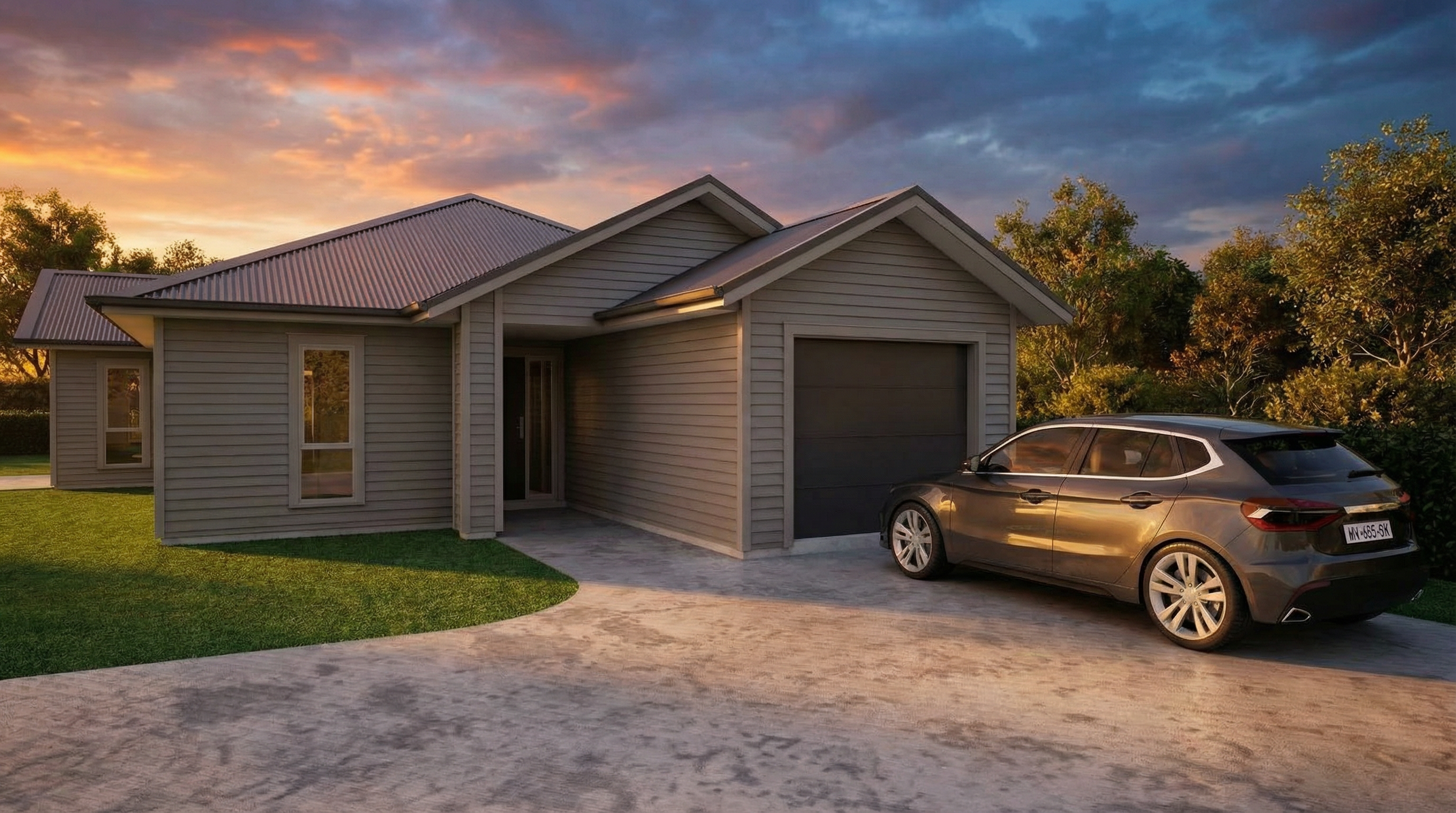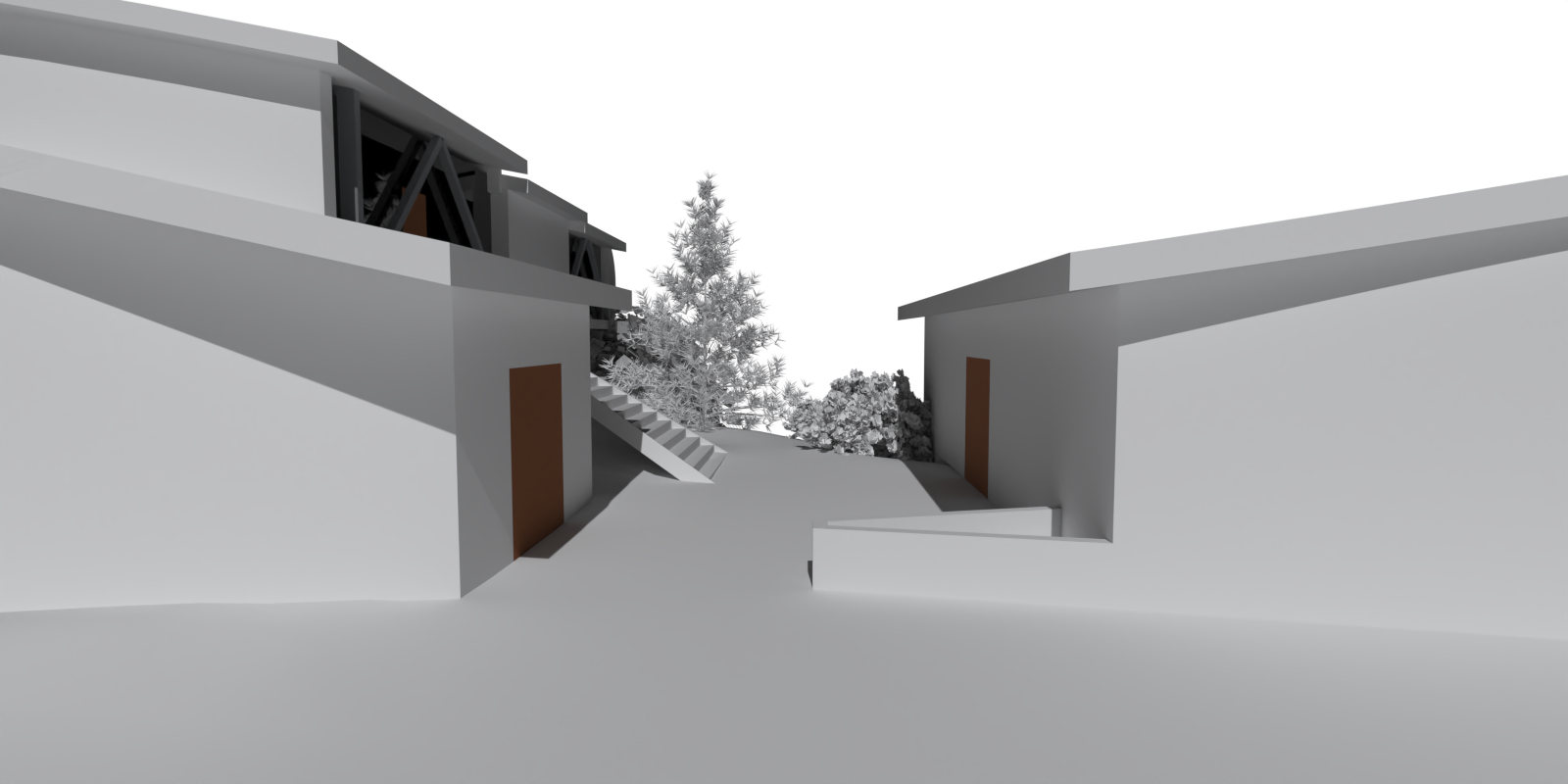 render the buildings in this image with soft textures the roofs are textured corrugated metal the walls are light wood like a cabin render the image so it architectural dimension overlay make it look like a technical sketch with loose watercolor washes and white paper soft unfinished fade around edges