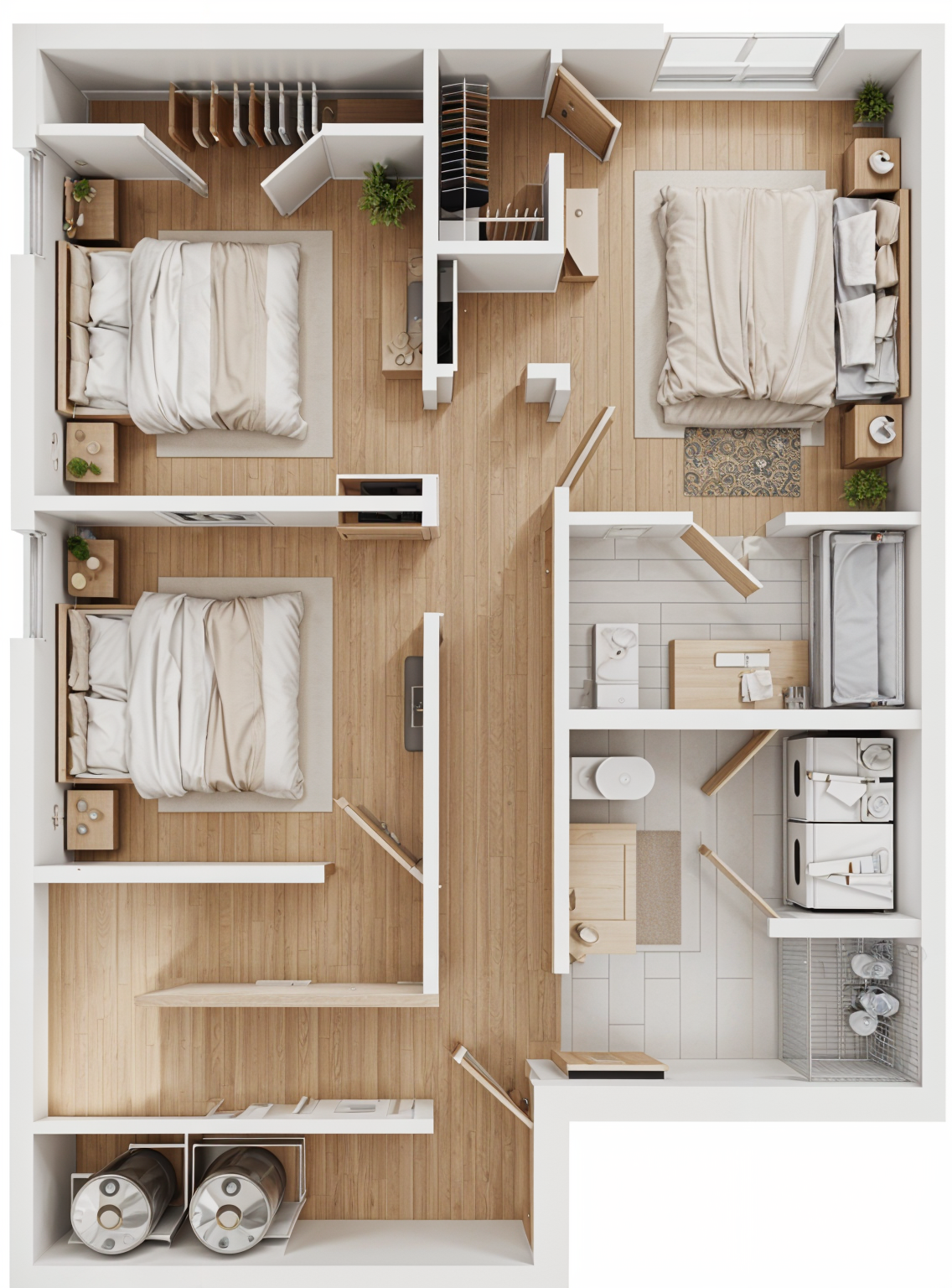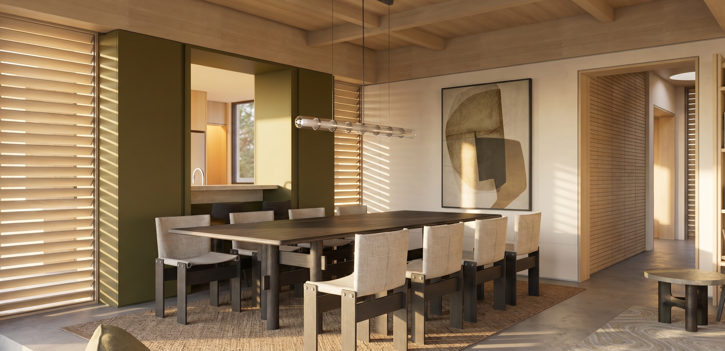 use this image as the base keep everything identical materials wood tone countertops hardware lighting styling cabinetry layout only change the painted cabinets render as a soft warm white with just a barely there cream undertone pull the beige tone back significantly the cabinets should read as a creamy off white from across the room elevated and quiet not beige not tan not taupe think a soft white with a whisper of warmth closer to a muted ivory than a warm greige all painted cabinets including the tall tower on the left wall and the upper cabinets flanking the hood should match this lighter cleaner cream white tone