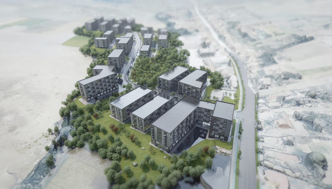 important preserve the existing geometry and the existing context exactly as provided do not modify alter reinterpret add remove scale or reshape any geometry do not change the site surroundings street layout neighboring buildings vegetation or context elements do not modify geometry scale proportions buildings road layout sidewalks or surrounding context in any way do not change text photorealistic architectural rendering clean and balanced contrast calm cinematic mood style contemporary european residential architecture minimalist premium understated delete all people soft sunny noon atmosphere diffused natural daylight with subtle blue grey tones cinematic architectural mood large glass surfaces with realistic reflections soft mirror effect subtle environmental reflections of sky and surroundings high dynamic range lighting realistic global illumination soft shadows calm and minimalist nordic mood photorealistic architectural visualization balanced exposure no harsh highlights warm interior lighting 3000k glowing from inside