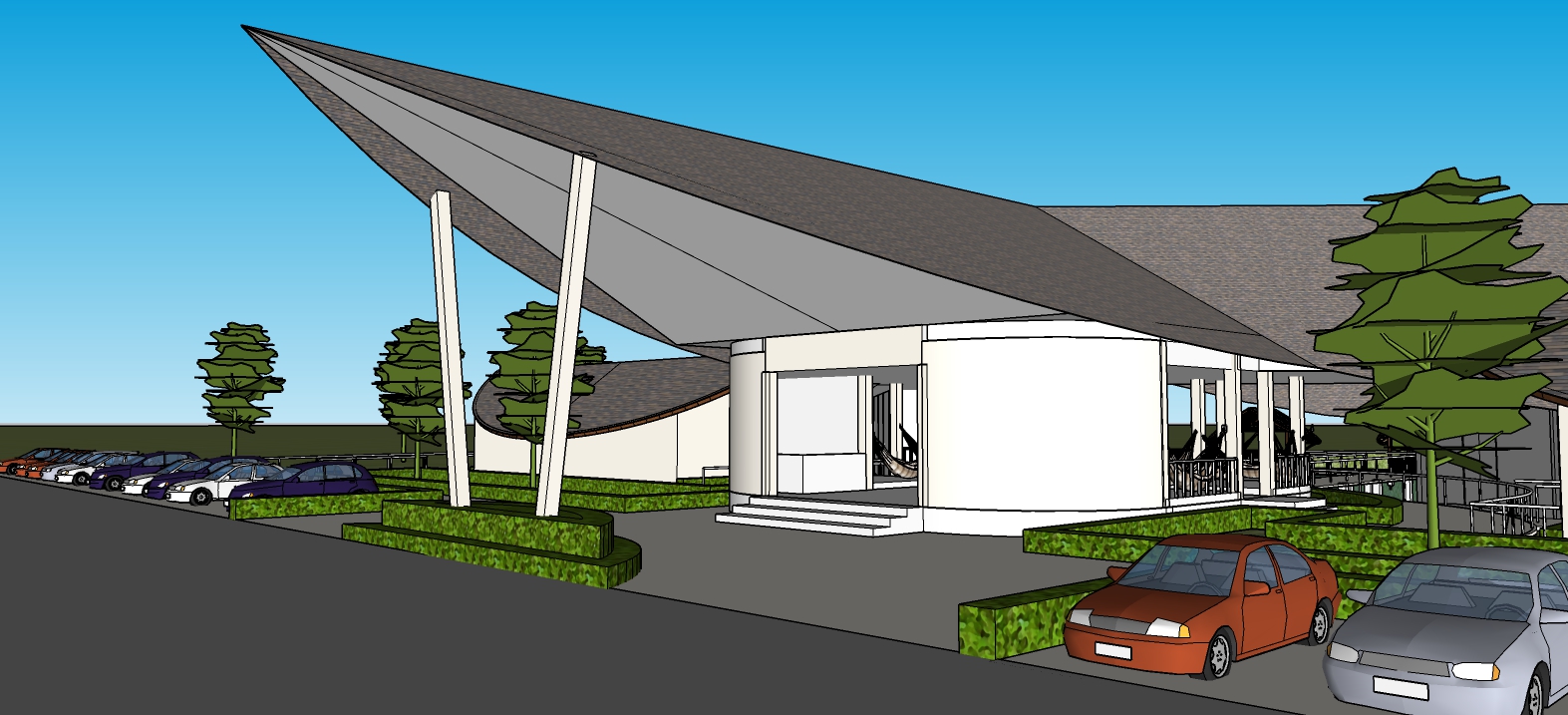 exterior shot realistic natural scene building in lake around with grass field roof shingle rood wood color add grass green color around roof light grey color realistic car brighter scene sunshine architecture
