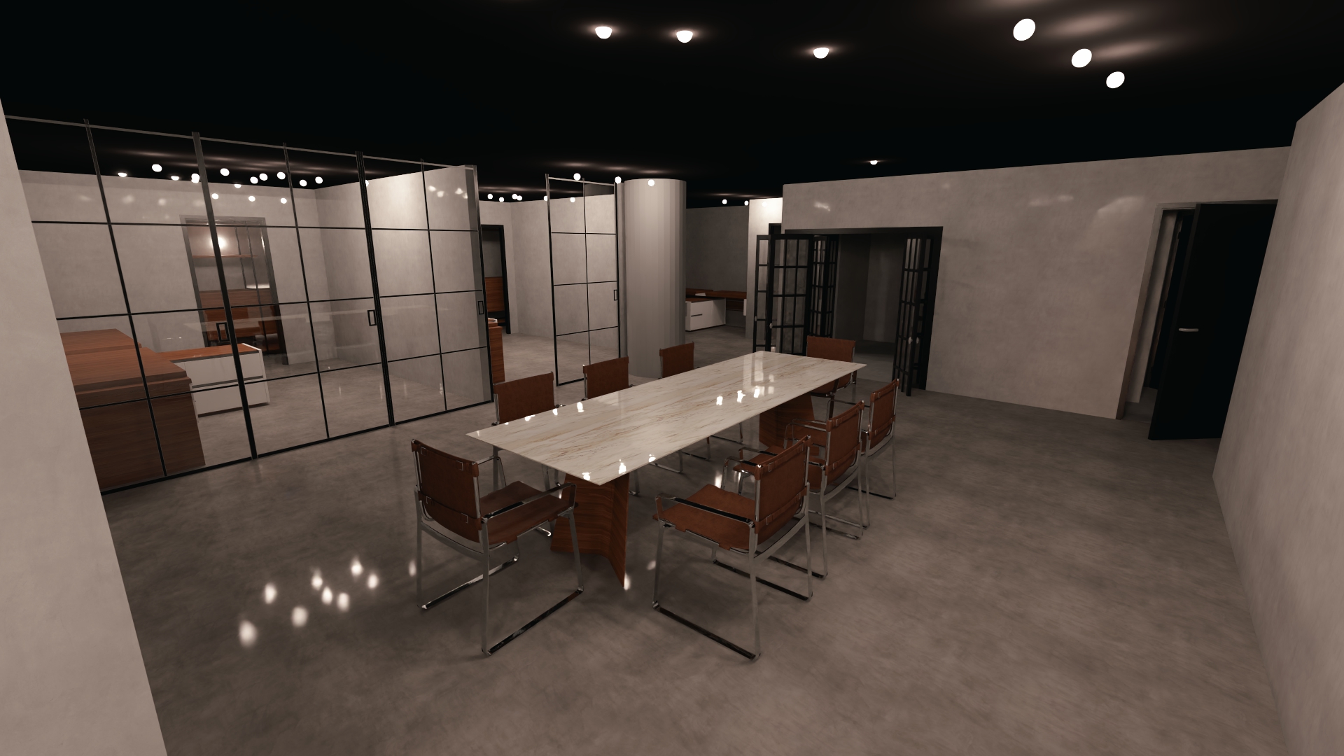 industrial film production office grey floor concrete walls and columns black framed glass doors light up interior add floor lamps with cloth white shades