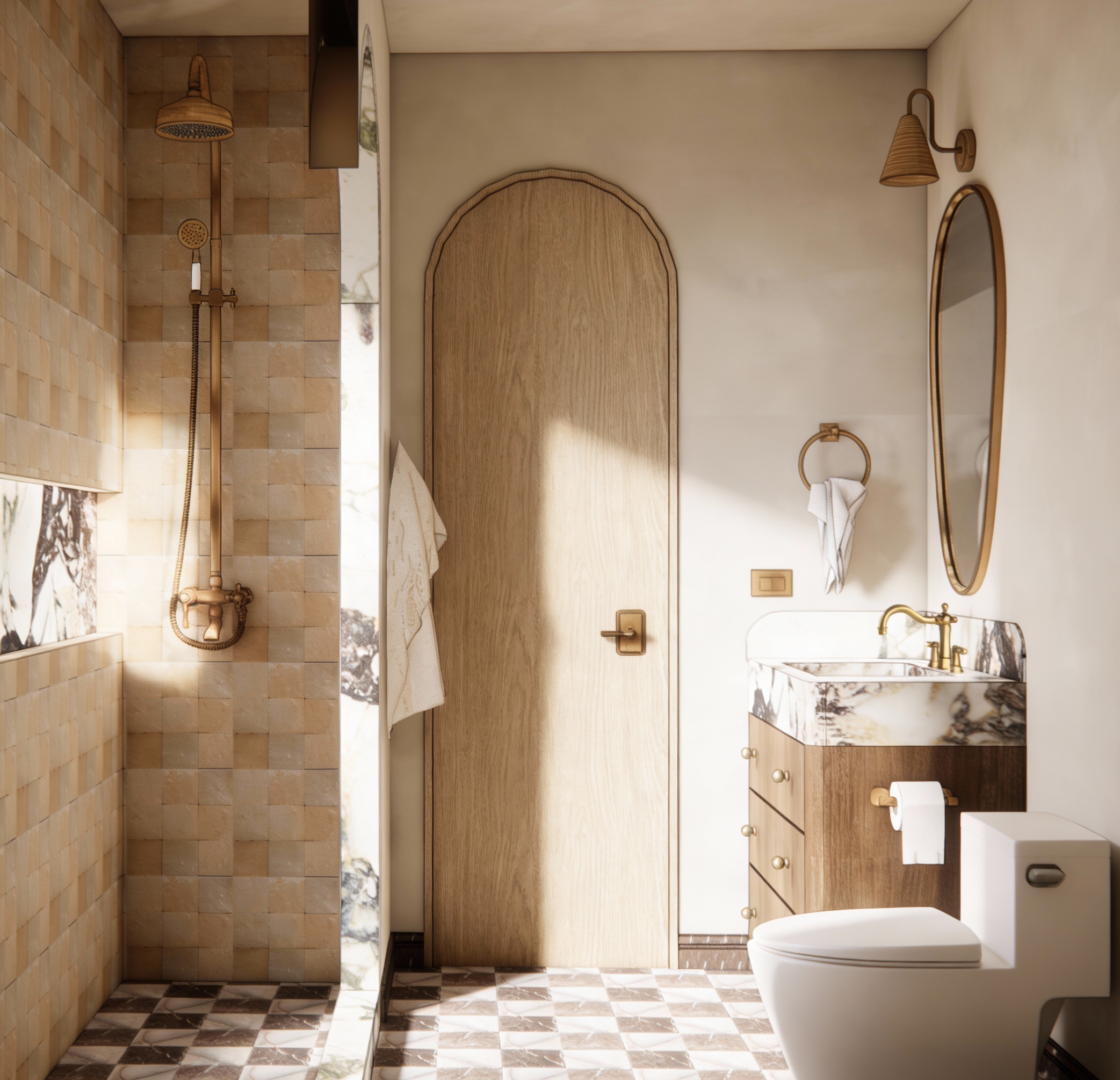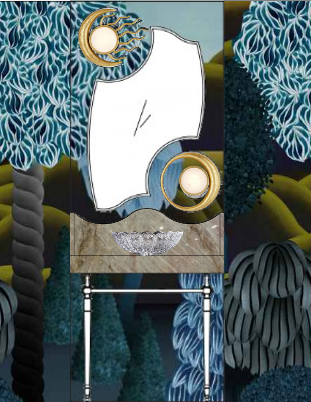 render a photorealistic image of this powder room with this wallpaper https www designersguild com en us wallpaper christian lacroix songe d ete marais wallpaper p35287 make the floor a black and white tile checkerboard