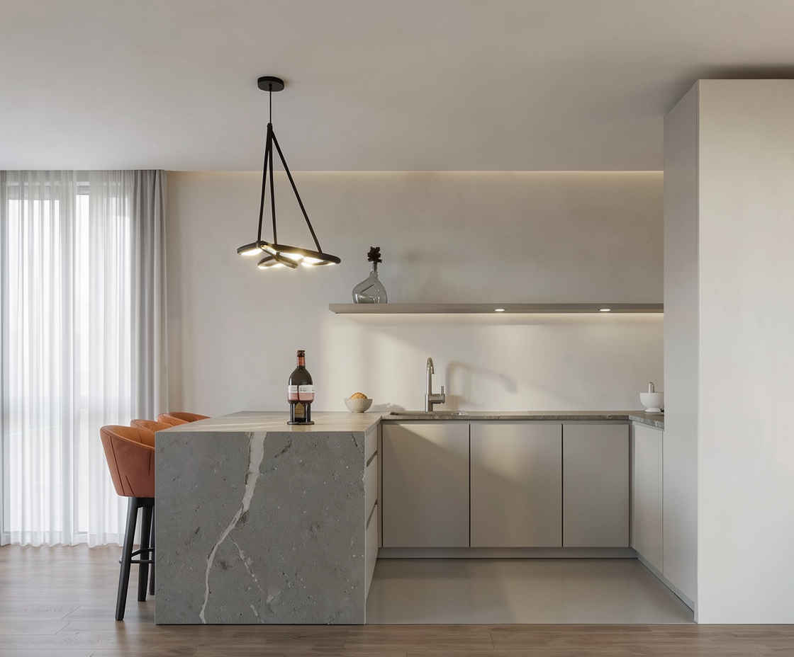 create a photorealistic render of the scene preserving all existing textures and include subtle led lighting underneath the tv unit
